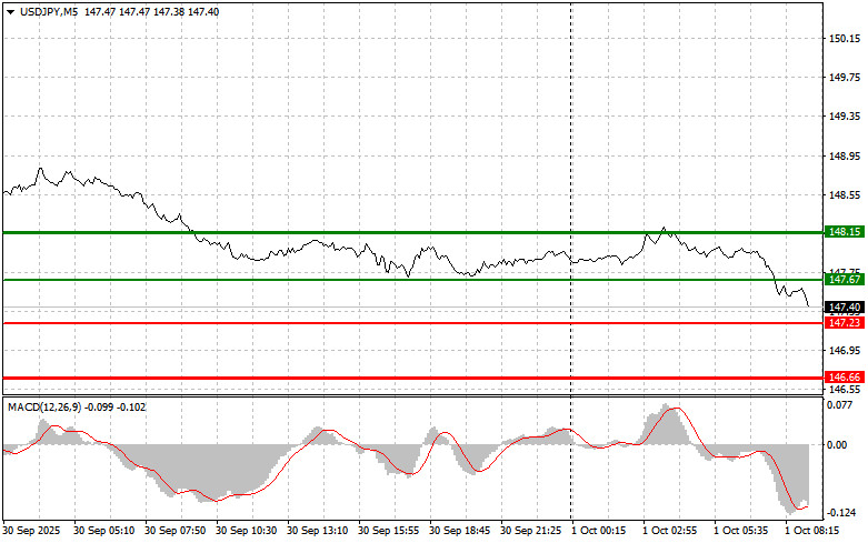 Разбор сделок и советы по торговле японской иенойТест цены 147.90 пришелся на момент, когда индикатор MACD только начинал движение вниз от нулевой отметки, что стало подтверждением правильной точки входа на продажу доллара далее по тренду. В результате пара снизилась лишь на 15 пунктов.Сегодня в ходе азиатской сессии японская иена продемонстрировала рост. Давление на доллар оказала приостановка работы правительства, вызванная неспособностью прийти к соглашению по финансированию на предстоящий бюджетный период. Этот фактор, наряду с ухудшением настроений на мировых рынках, спровоцировал бегство от рисковых активов и увеличение спроса на валюты-убежища, в число которых традиционно входит иена. Приостановка работы правительства США привела к замешательству на финансовых рынках, усилив неопределенность относительно перспектив американской экономики. Инвесторы опасаются, что затянувшийся шатдаун может негативно сказаться на темпах роста и привести к дальнейшим экономическим проблемам. В этой ситуации иена, как валюта надежного и стабильного государства, стала привлекательной альтернативой для тех, кто стремится обезопасить свои активы. Данные по производственному индексу PMI Японии не оказали сильной поддержки иене, хотя пересмотренный в лучшую сторону показатель трактовался в положительную сторону. Рынок, похоже, уже заложил в цены ожидание улучшения экономических показателей Страны восходящего солнца, и для дальнейшего укрепления иены необходимы более весомые аргументы. Инвесторы по-прежнему пристально следят за развитием ситуации в США и за действиями Банка Японии относительно возможного повышения процентных ставок до конца года.Что касается внутридневной стратегии, то больше буду опираться на реализацию сценариев №1 №2.Сценарии на покупкуСценарий №1: покупать USD/JPY сегодня планирую при достижении точки входа в районе 147.67 (зеленая линия на графике) с целью роста к уровню 148.15 (более толстая зеленая линия на графике). В районе 148.15 собираюсь выходить из покупок и открывать продажи в обратную сторону (расчет на движение в 30-35 пунктов в обратную сторону от уровня). К покупкам пары лучше всего возвращаться на коррекциях и серьезных просадках USD/JPY. Важно! Перед покупкой, убедитесь в том, что индикатор MACD находится выше нулевой отметки и только начинает свой рост от нее.Сценарий №2: покупать USD/JPY сегодня также планирую в случае двух подряд тестов цены 147.23 в момент, когда индикатор MACD будет находиться в области перепроданности. Это ограничит нисходящий потенциал пары и приведет к обратному развороту рынка вверх. Можно ожидать рост к противоположным уровням 147.67 и 148.15.Сценарии на продажу Сценарий №1: продавать USD/JPY сегодня планирую лишь после обновления уровня 147.23 (красная линия на графике), что приведет к быстрому снижению пары. Ключевой целью продавцов будет уровень 146.66, где собираюсь выходить из продаж, а также открывать сразу покупки в обратную сторону (расчет на движение в 20-25 пунктов в обратную сторону от уровня). Продавать лучше, как можно выше. Важно! Перед продажей, убедитесь в том, что индикатор MACD находится ниже нулевой отметки и только начинает свое снижение от нее. Сценарий №2: продавать USD/JPY сегодня также планирую в случае двух подряд тестов цены 147.67 в момент, когда индикатор MACD будет находиться в области перекуп