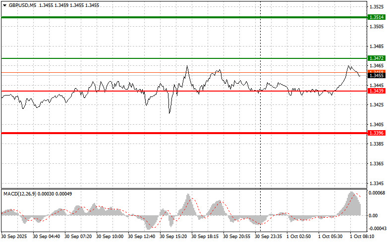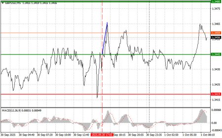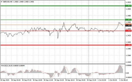Разбор сделок и советы по торговле британским фунтомТест цены 1.3445 пришелся на момент, когда индикатор MACD только начинал движение вверх от нулевой отметки, что стало подтверждением правильной точки входа на покупку фунта и вылилось в рост на 20 пунктов. Сегодня британский фунт продолжил рост в ходе азиатских торгов, так как дополнительное давление на американский доллар было оказано шатдауном экономики, который наступил из-за отсутствия консенсуса по согласованию расходов на следующий финансовый год. Разногласия в американском Конгрессе, приведшие к приостановке работы правительства, вызвали волну опасений среди инвесторов, которые стали избавляться от долларовых активов, ища более безопасные гавани. Фунт, таким образом, воспользовался моментом, укрепив свои позиции на фоне ослабления американского конкурента.Дальше акцент будет на публикации индекса PMI для промышленности Соединенного Королевства. Этот показатель находится под пристальным вниманием экспертов. Неоднозначные результаты, демонстрируемые производственным сектором в последнее время, делают предстоящий отчет особенно значимым для оценки его ближайших перспектив. Положительные данные окажут поддержку курсу фунта и подтвердят стабильность британской экономики, в то время как слабые показатели могут усилить опасения относительно надвигающейся рецессии. Одновременно с выходом PMI будет обнародован протокол заседания Комитета по денежно-кредитной политике Банка Англии. Этот документ позволит инвесторам получить исчерпывающее представление об аргументах, которые использовались членами КДП при принятии решений относительно процентных ставок и других инструментов монетарной политики. В центре внимания окажутся обсуждения вопросов инфляции, перспектив экономического роста и рисков, угрожающих финансовой устойчивости.Завершит утреннюю программу выступление Кэтрин Л. Манн, одного из членов КДП Банка Англии. Ее речь может предоставить ценную информацию о текущей позиции Банка Англии в отношении дальнейшей денежно-кредитной политики. Рынок будет анализировать каждое слово в поисках сигналов о том, когда Банк Англии может приостановить повышение процентных ставок или даже перейти к их снижению. Что касается внутридневной стратегии, то больше буду опираться на реализацию сценариев №1 №2.Сценарии на покупкуСценарий №1: покупать фунт сегодня планирую при достижении точки входа в районе 1.3472 (зеленая линия на графике) с целью роста к уровню 1.3514 (более толстая зеленая линия на графике). В районе 1.3514 собираюсь выходить из покупок и открывать продажи в обратную сторону (расчет на движение в 30-35 пунктов в обратную сторону от уровня). Рассчитывать на рост фунта сегодня можно в продолжение бычьей тенденции после сильных данных. Важно! Перед покупкой, убедитесь в том, что индикатор MACD находится выше нулевой отметки и только начинает свой рост от нее.Сценарий №2: покупать фунт сегодня также планирую в случае двух подряд тестов цены 1.3439 в момент, когда индикатор MACD будет находиться в области перепроданности. Это ограничит нисходящий потенциал пары и приведет к обратному развороту рынка вверх. Можно ожидать рост к противоположным уровням 1.3472 и 1.3514.Сценарии на продажу Сценарий №1: продавать фунт сегодня планирую после обновления уровня 1.3439 (красная линия на г