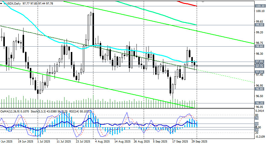 На фоне неоднозначной макростатистики, поступившей во вторник из США, и в ожидании закрытия американского правительства доллар и его индекс USDX продолжили снижение, сегодня уже 4-й день подряд. В ходе азиатской торговой сессии индекс доллара USDX достиг нового 5-дневного минимума ниже отметки 97.50. *) см. также: Торговые индикаторы InstaForex по USDX[/i] Согласно представленным во вторник данным, число вакансий на рынке труда США в августе составило 7,22 млн при прогнозе в 7,2 млн и предыдущего значения в 7,208 млн. В то же время индекс потребительского доверия от CB снизился в сентябре до 94,2 с пересмотренного (от 97,4) значения 97,8 в предыдущем месяце. Другие статьи отчета Conference Board также оказались с показателями слабее предыдущих значений. Доллар попал под давление после этой публикации, отметили мы в нашем [i]вчерашнем обзоре. В то же время ожидания первого за 7 лет закрытие правительства США из-за разногласий между демократами и республиканцами по поводу финансирования правительства вынудили инвесторов продавать доллар США практически по всем направлениям. Эти продажи и снижение индекса доллара USDX продолжились и в ходе сегодняшней азиатской торговой сессии. Тем не менее доллар нашел в себе силы сократить некоторую часть потерь в первой половине европейской торговой сессии, а его индекс USDX – подняться к уровню цены закрытия минувшего дня и к отметке 97.80 на момент публикации данной статьи. Несмотря на это, доллар остается под давлением: слабые данные по занятости в США продолжают оказывать на него негативное влияние. Хотя количество открытых вакансий JOLTS умеренно увеличилось в августе, но низкий уровень найма сохраняет беспокойство инвесторов по поводу охлаждения рынка труда и актуализирует вероятность дальнейшего смягчения монетарной политики американского ЦБ. Участники рынка закладывают в цены снижение ставки ФРС в октябре с вероятностью почти в 90%, по данным CME Group, и в 70-75% еще одно снижение на 0,25% в декабре. Сегодня инвесторы будут изучать отчет по занятости ADP в США, чтобы получить подсказки насчёт перспектив монетарной политики ФРС, а значит и доллара. Данный отчет предполагает, что в сентябре в частном секторе экономики США было создано 50 тыс. рабочих мест. Это ниже, чем 54 тыс. в августе, и значительно ниже средних показателей (около 100 тыс.) прошлого года. Как известно, по итогам сентябрьского заседания руководители ФРС снизили ставку на 0,25%, впервые в этом году и не исключили возможность дальнейших снижений, если инфляция не будет расти, а рынок труда потребует поддержки. В то же время глава ФРС Джером Пауэлл и некоторые другие члены FOMC указали на необходимость осторожности в снижениях из-за повышательных рисков инфляции. Отчет ADP будет опубликован сегодня в 12:15 (GMT), а в 14:00 американский институт управления поставками (ISM) опубликует свой индекс деловой активности (или менеджеров по закупкам) PMI для производственного сектора. Индекс PMI считается опережающим индикатором и может сигнализировать об изменениях в динамике развития данного сектора экономики. Ожидается относительный рост показателя в сентябре до 49,0 с 48,7 месяцем ранее. Рост и показатель выше прогнозов обычно позитивно влияют на USD. Но в отчете ISM также имеются показатели занятости и уплаченных цен, которые могут указать на состояние рынка труда и инфляции и оказать влияние на долла