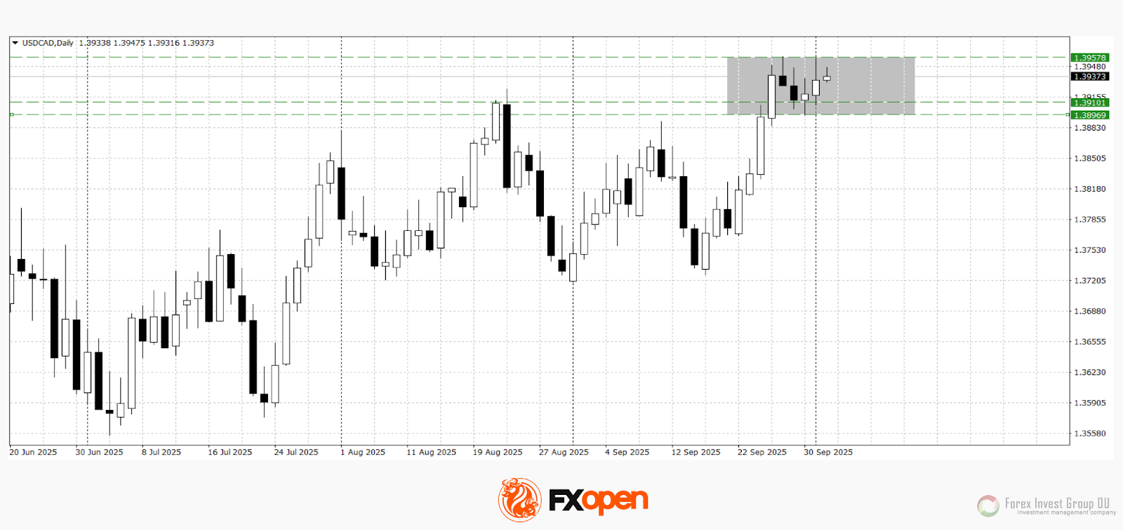 В конце сентября покупателям доллара в паре USD/JPY почти удалось протестировать важный уровень сопротивления у 150.00. Тем не менее замедление восходящего импульса позволило долларовым «медведям» перехватить инициативу и сформировать Несмотря на негативный новостной фон по доллару, покупатели в паре USD/CAD уверенно удерживают цену вблизи 1.3900. Вчера пара повторно протестировала 1.3960, но пока возобновления восходящего импульса не наблюдается. Технический анализ USD/CAD указывает на боковой характер торговли в диапазоне 1.3890-1.3960. Пробой и выход за границы данного диапазона может стать определяющим для среднесрочного вектора торговли по паре. Повлиять на вектор движения USD/CAD могут следующие события: Торгуйте более чем 50 валютными парами 24 часа в сутки с FXOpen. Воспользуйтесь низкими комиссиями, глубокой ликвидностью и спредами от 0,0 пипса. [url=https://fxopen.com/open-account//?agent=XX54FXPNXXG6008310001]Откройте счетUSD/CAD