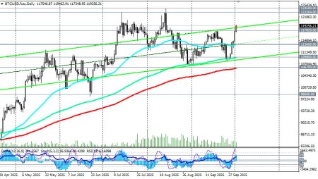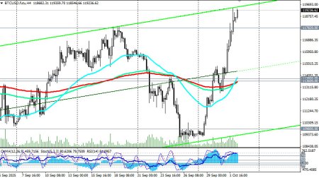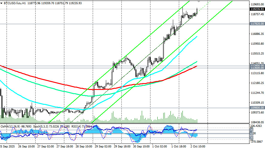 Исторически, 4-й квартал является благоприятным периодом для роста криптовалют, поэтому перспективы для них позитивные. В течение 4-четвертого квартала Bitcoin останется главным драйвером динамики рынка криптовалют и вполне вероятно продолжение его движения вверх. Прогнозируемая экспертами цель для BTC на конец года 126000.00 – 127000.00, что соответствует новому историческому максимуму, отметили мы в нашем вчерашнем обзоре «Крипторынок: перспективы на 4-й квартал». На момент публикации данной статьи, пара BTC/USD торговалась вблизи отметки 119200.00, на 1,4% выше цены закрытия вчерашнего торгового дня. BTC/USD торгуется в зоне устойчивого бычьего рынка, выше ключевых уровней поддержки 106700.00 (ЕМА200 на дневном графике), 64000.00 (ЕМА200 на недельном графике), что делает преимущественными длинные позиции. Интерес к покупкам рискованных активов сохраняются, а фундаментальные факторы способствуют росту BTC/USD, особенно, учитывая сохраняющийся приток средств инвесторов в ETF-биткойн фонды. Если доллар останется под давлением, то логично ожидать роста основных цифровых валют, в том числе биткоина. Пробой сегодняшнего максимума 119460.00 мог бы стать первым сигналом для наращивания длинных позиций, а целью – отметки вблизи рекордного максимума 124500.00, достигнутого в августе. В альтернативном сценарии и после пробоя сегодняшнего минимума 117350.00 коррекция может продлиться к важному уровню поддержки 113850.00 (ЕМА200 на 1-часовом графике, ЕМА50 на дневном графике), коррекция может продлиться к важному уровню поддержки 113700.00 (ЕМА200 на 4-часовом графике и ЕМА50 на дневном графике), а после его пробоя – к зоне ключевых уровней поддержки 109800.00 (ЕМА144 на дневном графике ), 106700.00 (ЕМА200 на дневном графике), от которых можно будет рассчитывать на отбой и возобновление роста. Предпочтительными по-прежнему остаются длинные позиции. Любая коррекция к уровням поддержки может рассматриваться, в этом случае, как повод для наращивания длинных позиций. Уровни поддержки: 113850.00, 113700.00, 110000.00, 109800.00, 109000.00, 106700.00, 104000.00, 99000.00, 73000.00, 64000.00 Уровни сопротивления: 119500.00, 120000.00, 124000.00, 124500.00, 125000.00, 126000.00, 127000.00, 130000.00, 140000.00 Торговые сценарии