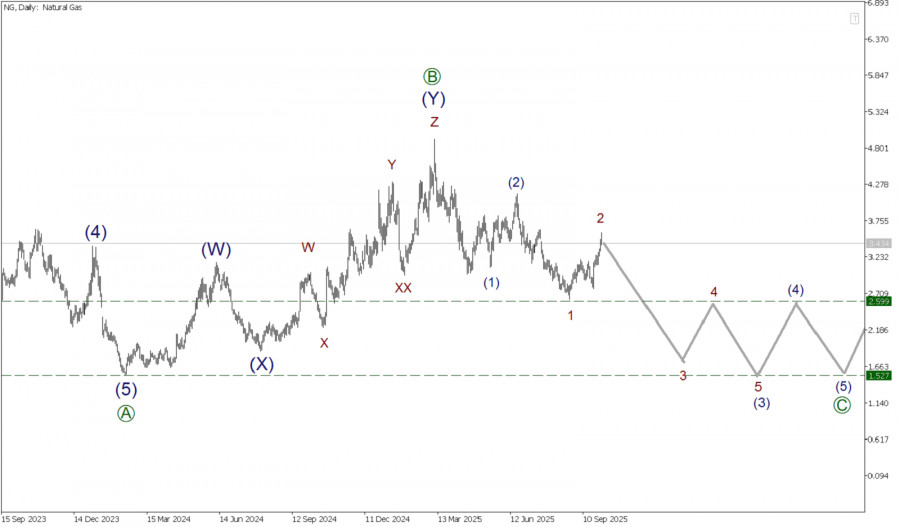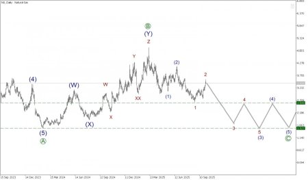 Глядя на текущий график, можно заметить, что по газу может формироваться крупный коррекционный тренд. На текущем графике представлена разметка большой действующей волны (Y), принимающей форму тройного зигзага W-X-Y-XX-Z. На текущем графике мы видим, что действующая волна Z похожа на стандартный зигзаг, внутри которого завершен импульс [A]. Сейчас может формироваться коррекционная подволна [B], которая, судя по всему, принимает форму двойного зигзага (W)-(X)-(Y). Предполагается, что на сегодняшний день завершена только первая действующая волан (W), она приняла форму двойного зигзага W-X-Y. Сейчас в процессе развития может находиться противодействующая волна связка (X), она тоже представляет собой двойной зигзаг W-X-Y. На последнем участке графика может формироваться финальная зигзагообразная волна Y. Внутри волны Y могла подойти к концу коррекционная подволна [B], поэтому в ближайшее время участников рынка может ждать разворот цены и начало падения в импульсе [C]. Вполне возможно, что быки поведут рынок за собой в сторону уровня 1.52. На указанной отметке ранее была завершена подволна [A]. В текущей ситуации можно рассматривать открытие коротких позиций. Торговые рекомендации: Sell 3.43, takeprofit 2.59.