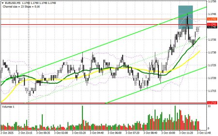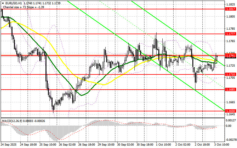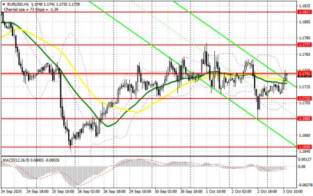 В своем утреннем прогнозе я обращал внимание на уровень 1.1741 и планировал от него принимать решения по входу в рынок. Давайте посмотрим на 5-минутный график и разберемся с тем, что там произошло. Рост и формирование ложного пробоя в районе 1.1741 привели к точке входа на продажу евро, но до крупного падения пары дело так и не дошло. На вторую половину дня техническая картина не пересматривалась.Для открытия длинных позиций по EURUSD требуется: Данные по активности индексов PMI стран еврозоны совпали с прогнозами экономистов, что сохранило на рынке равновесие. Во второй половине дня нет важной статистики по рынку труда США, так как ее публикация заморожена из-за приостановки работы правительства. По этой причине весь акцент будет на цифрах по индексу деловой активности в секторе услуг от ISM и композитному индексу PMI за сентябрь этого года. Также состоится выступление члена FOMC Джона Уильямса. Лишь слишком большое расхождение фактических данных с прогнозами приведет ко всплеску рыночной волатильности. В случае возврата давления на пару лишь формирование ложного пробоя в районе 1.1710 будет поводом для открытия новых длинных позиций в расчете на обновление сопротивления 1.1741, выше которого сейчас покупатели пытаются закрепиться. Прорыв и обратный тест этого диапазона станут подтверждением правильной точки вход с выходом к области 1.1777. Самой дальней целью будет уровень 1.1818, где буду фиксировать прибыль. При варианте снижения EUR/USD и отсутствия активности в районе 1.1710, пара вернется к падению. Медведи в таком случае сумеют дотянуться до 1.1685. Лишь после формирования там ложного пробоя собираюсь действовать на покупку евро. Открывать длинные позиции сразу на отскок планирую от 1.1650 с целью восходящей коррекции в 30-35 пунктов внутри дня. Для открытия коротких позиций по EURUSD требуется: Продавцы пока не проявили себя, видимо ожидая более интересных цен. Учитывая, что на 1.1745 трейдеры себя не показали, действовать теперь собираюсь после теста уровня 1.1777. Лишь формирование там ложного пробоя будет для меня поводом для коротких позиций с целью снижения к уровню 1.1741, выступающего серединой бокового канала. Прорыв и закрепление ниже этого диапазона станут подходящим вариантом на продажу уже с движением в район 1.1710. Самой дальней целью выступит область 1.1685, где буду фиксировать прибыль. В случае движения вверх EUR/USD во второй половине дня, а также отсутствия активных действий медведей в районе 1.1777, покупатели получат шанс на более крупный рывок, что откроет дорогу в район следующего сопротивления 1.1818. Продавать там буду только после неудачного закрепления. Открывать короткие позиции сразу на отскок я планирую от 1.1847 с целью нисходящей коррекции в 30-35 пунктов.Рекомендую ознакомиться: В COT-отчете (Commitment of Traders) за 23 сентября наблюдался рост коротких позиций и сокращение длинных. В COT-отчете указано, что длинные некоммерческие позиции сократились на 789 до уровня 252 472, в то время как короткие некоммерческие позиции выросли на 2 625 до уровня 138 127. В результате спрэд между длинными и короткими позициями сократился на 33 691.Сигналы индикаторов: [b]Средние скользящиеwww.instaforex.com
