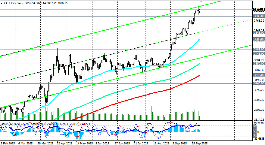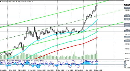 Инвесторов продолжает беспокоить временная остановка работы американского правительства, начавшаяся ранее, способная, судя по оценкам экспертов, затянуться минимум на две недели. Ранее ожидалось, что сегодня выйдет сентябрьская сводка рынка труда США, однако шатдаун лишил участников рынка своевременного доступа к важным данным. Министерство труда подтвердило, что публикация сентябрьского отчета по занятости не состоится в запланированную пятничную дату, а процесс сбора статистики временно остановится. Из-за этого в ФРС будут ориентироваться на уже опубликованные альтернативные данные, отметили мы в нашем сегодняшнем обзоре «Доллар: ситуация крайне неопределённая». Поскольку традиционные индикаторы Министерства труда США временно отсутствуют, сегодня рынок находится в ожидании отчета от Института управления поставками (ISM), который выйдет в 14:00 (GMT) и отразит состояние сферы услуг американской экономики. По предварительным оценкам, сентябрьский показатель индекса PMI сектора услуг ISM составит около 51,7 пункта, незначительно уступив августовским данным (52). Несмотря на снижение значения, оно всё равно остаётся позитивным сигналом роста активности в данном сегменте экономики. Однако основное внимание инвесторов привлечёт динамика двух ключевых компонентов: занятость и инфляция. Важно отметить, что, несмотря на некоторое замедление темпов роста числа новых рабочих мест, общее инфляционное давление постепенно снижается. Эти тенденции подтверждают готовность ФРС продолжить цикл снижения ставок. Так, согласно последнему исследованию АDP, американская экономика лишилась почти 35 тысяч рабочих мест в частном секторе в течение сентября и ещё трёх тысяч в предыдущем месяце. *) см. также: Торговые индикаторы InstaForex по XAU/USD[/i] Тем временем золото демонстрирует стабильную динамику, удерживая цену выше отметки в 3850.00 долларов за унцию. Общие перспективы золота остаются положительными, несмотря на временные коррекции. Покупатели же воспринимают любую коррекцию как хорошую возможность приобрести металл дешевле. Это связано с высоким уровнем спроса на защитные активы в условиях продолжающегося кризиса власти в США, а также усиливающихся ожиданий смягчения монетарной политики Федрезервом позднее в октябре. На момент публикации данной статьи пара XAU/USD торговалась вблизи отметки 3870.00, сохраняя бычий импульс, торгуясь также вблизи вчерашнего и рекордного максимума 3896.00. Инвесторы ожидают более быстрого снижения ставок, чем прогнозирует ФРС, и делают ставки на падение ставки ниже 3% к концу 2026 года. Как известно, котировки золота крайне чувствительны к изменениям параметров монетарных политик крупнейших мировых ЦБ, прежде всего ФРС. Снижение процентных ставок ФРС уменьшает стоимость приобретения и хранения золота, что делает его более привлекательным активом. Обострение же конфликта между Россией и Украиной, а также напряженность в отношениях США и России, связанная с тарифами и инцидентами с участием НАТО, повышают спрос на золото как на «безопасный актив». В то время как перспективы доллара остаются негативными, фундаментальный фон складывается в пользу традиционных защитных активов, в частности золота. Вероятно, совсем скоро мы сможем увидеть обновление исторических максимумов, и, не исключено, что уже сегодня, если данны