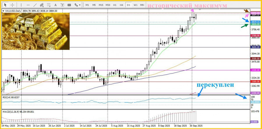 А с технической точки зрения, RSI - индекс относительной силы на дневном графике находится в зоне перекупленности, подтверждая консолидацию цен. Любое снижение будет использовано как возможность для покупок, ограничиваясь зоной $3820–3819. Но пробитие круглого уровня $3800 открыть путь к более значительным потерям.