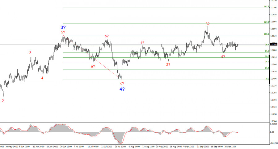 Курс инструмента EUR/USD в течение пятницы практически не изменился, как и в течение всей текущей недели. Если британец еще хоть немного двигался, то европеец прочно застрял на одном месте. Самое интересное, что застрял он именно в тот момент, когда новостной фон чуть ли не каждый день сотрясал рынок. Может быть, слово «сотрясал» не совсем подходящее, но согласитесь, шатдаун + отчет ADP + отсутствие отчетов по безработице и Nonfarm Payrolls + отчет по инфляции – это веские поводы торговать хотя бы немного активнее. Но торгов на этой неделе фактически не было. По понятным причинам, волновая разметка не изменилась за последние 5 дней. Следовательно, делать выводы я могу сейчас только по волновому анализу. А он по-прежнему предполагает повышение котировок европейской валюты. Новостной фон на этой неделе также поддерживал покупателей, потому что рынок труда США вновь показал очень слабые результаты. Правда, на этот раз судить можно было только по отчету ADP, который считается менее значимым, чем отчет Nonfarm Payrolls. Но «на безрыбье»... Исходя из всего вышесказанного, я не ждал и не жду укрепления американской валюты, потому что ситуация для него с каждым днем становится только хуже. Теперь непонятно, когда завершится шатдаун, непонятно, какими будут цифры по рынку труда за сентябрь и октябрь, непонятно, растет ли безработица, а под угрозой находится еще и отчет по инфляции в середине месяца...Общие выводы.