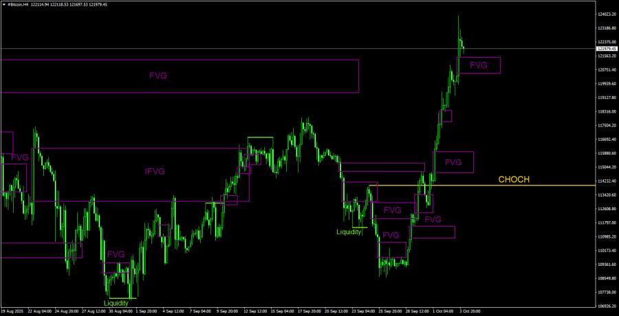 На 4-часовом таймфрейме проводить анализ сейчас не имеет никакого смысла. Цена летит вверх со скоростью света, не обращая внимания на паттерны и формируя пачками «бычьи» FVG. Формально, если вы все также настроены на покупки, можно использовать эти паттерны для открытия длинных позиций. Только вот цена даже минимальных коррекций не формирует. Открывать длинные позиции в большинстве случаев неоткуда.Рекомендации по торговле BTC/USD:
