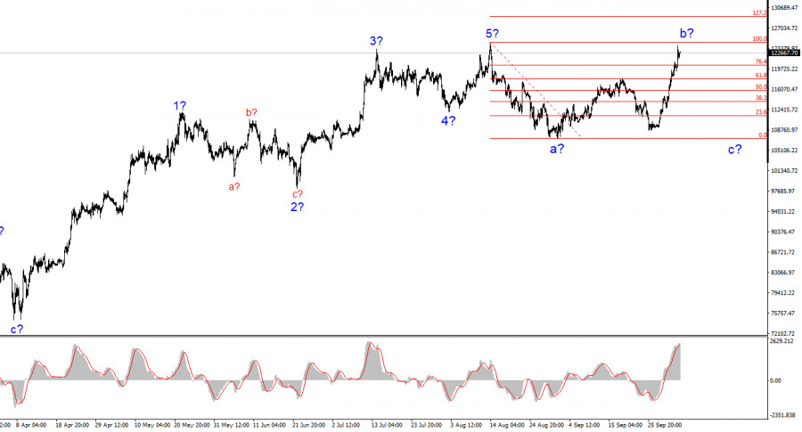 Исходя из проведенного анализа BTC/USD, я делаю вывод, что построение повышательной структуры завершено. Новостной фон не был причиной резкого роста биткоина в последние месяцы, но институциональные инвестиции сделали свое дело. Биткоин трижды не сумел преодолеть отметку 122000$, каждый подход к ней сопровождался довольно сильным падением. Соответственно, волна 5 приняла укороченный вид, и в этом случае повышательный набор выглядит полностью укомплектованным. Исходя из этого, продажи сейчас более интересны. Текущая волновая разметка не отменена, поэтому я жду завершения построения волны b и возобновления снижения с целями, расположенными ниже 107000$.Основные принципы моего анализа: