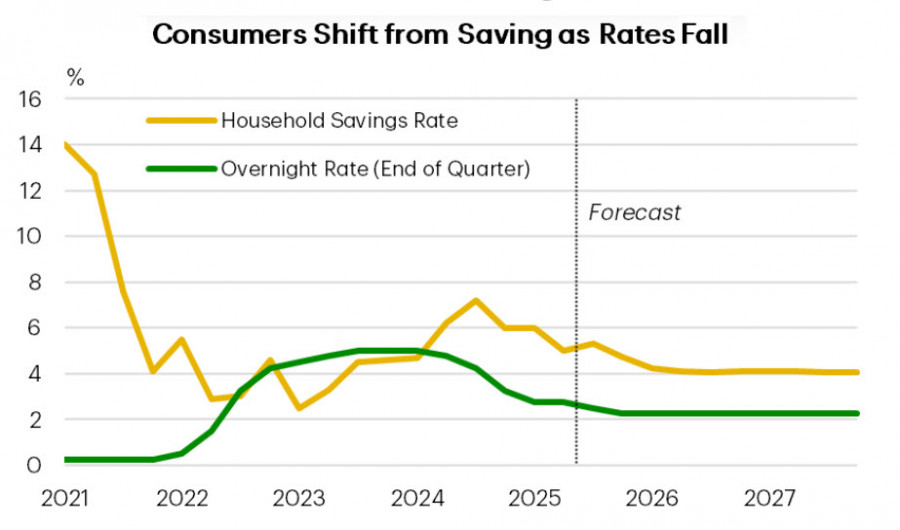 Торговый дефицит Канады увеличился в августе до 6.3 млрд против 3.8 млрд в июле, основная причина, конечно, – новые тарифы, что, в свою очередь, привело к снижению экспорта в США. Слабый экспорт окажет давление на темпы роста ВВП в 3 квартале, поэтому вероятность роста после провального второго квартала (-0,4%) остается невысокой. Потребительский спрос в Канаде растет, основная причина – снижение процентных ставок, что привело к росту расходов домохозяйств. Не помешала даже угроза роста цен из-за новых тарифов США, во втором квартале потребительские расходы выросли на 4.5%. Рост потребительских расходов пока недостаточен, чтобы уверенно ожидать быстрого восстановления экономики, до конца года, как прогнозируется, он будет на уровне 1.3-1.4% м/м, что ниже трендового уровня. Из-за роста расходов норма сбережений также снижается, в условиях высокой безработицы это создает угрозу потребительскому спросу уже в ближайшем будущем.