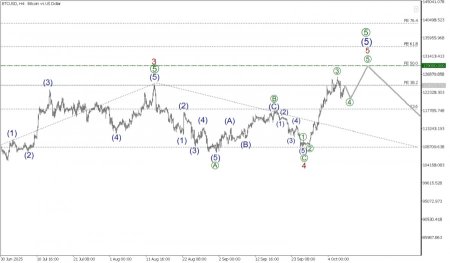 FxSignal Вчера, 21:42 1 Аналитика, прогнозы валютного рынкаВ долгосрочной перспективе по криптовалютной паре BTC/USD может формироваться крупный бычий импульс 1-2-3-4-5. Большая часть указанной фигуры полностью завершена. Сейчас в стадии разработки находится коррекционная волна 4. Волна 4 может принять форму стандартного зигзага [A]-[B]-[C]. Есть большая вероятность, что коррекция 4 уже закончена, сейчас цена движется вверх в импульсе 5. Внутри потенциального импульса завершены подволны [1]-[2]-[3]-[4]. В ближайшее время ожидается рост в финальной подволне [5] в направлении уровня 129000.00. На указанной отметке величина волны 5 может составить 50% по линиям Фибоначчи от предыдущего импульса 3. В такой ситуации возможен рост к ценовой отметке 129000.00. Таким образом можно рассматривать открытие длинных позиций с текущего уровня. Торговые рекомендации: buy 124023.63, takeprofit 129000.00.