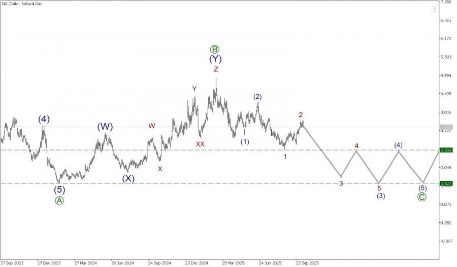 Глядя на текущий график, можно заметить, что по газу может формироваться крупный коррекционный тренд. На текущем графике представлена разметка большой действующей волны (Y), принимающей форму тройного зигзага W-X-Y-XX-Z. На текущем графике мы видим, что действующая волна Z похожа на стандартный зигзаг, внутри которого завершен импульс [A]. Сейчас может формироваться коррекционная подволна [B], которая, судя по всему, принимает форму двойного зигзага (W)-(X)-(Y). Предполагается, что на сегодняшний день завершена только первая действующая волан (W), она приняла форму двойного зигзага W-X-Y. Сейчас в процессе развития может находиться противодействующая волна связка (X), она тоже представляет собой двойной зигзаг W-X-Y. На последнем участке графика может формироваться финальная зигзагообразная волна Y. Внутри волны Y могла подойти к концу коррекционная подволна [B], поэтому в ближайшее время участников рынка может ждать разворот цены и начало падения в импульсе [C]. Вполне возможно, что быки поведут рынок за собой в сторону уровня 1.52. На указанной отметке ранее была завершена подволна [A]. В текущей ситуации можно рассматривать открытие коротких позиций. Торговые рекомендации: Sell 3.31, takeprofit 2.59.