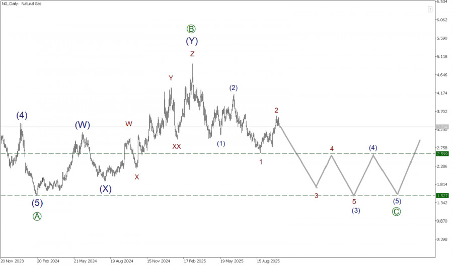 FxSignal Вчера, 18:24 6 Аналитика, прогнозы валютного рынкаГлядя на текущий график, можно заметить, что по газу может формироваться крупный коррекционный тренд. На текущем графике представлена разметка большой действующей волны (Y), принимающей форму тройного зигзага W-X-Y-XX-Z. На текущем графике мы видим, что действующая волна Z похожа на стандартный зигзаг, внутри которого завершен импульс [A]. Сейчас может формироваться коррекционная подволна [B], которая, судя по всему, принимает форму двойного зигзага (W)-(X)-(Y). Предполагается, что на сегодняшний день завершена только первая действующая волан (W), она приняла форму двойного зигзага W-X-Y. Сейчас в процессе развития может находиться противодействующая волна связка (X), она тоже представляет собой двойной зигзаг W-X-Y. На последнем участке графика может формироваться финальная зигзагообразная волна Y. Внутри волны Y могла подойти к концу коррекционная подволна [B], поэтому в ближайшее время участников рынка может ждать разворот цены и начало падения в импульсе [C]. Вполне возможно, что быки поведут рынок за собой в сторону уровня 1.52. На указанной отметке ранее была завершена подволна [A]. В текущей ситуации можно рассматривать открытие коротких позиций. Торговые рекомендации: Sell 3.29, takeprofit 2.59.