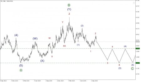 FxSignal 13-10-2025, 19:52 37 Аналитика, прогнозы валютного рынкаГлядя на текущий график, можно заметить, что по газу может формироваться крупный коррекционный тренд. На текущем графике представлена разметка большой действующей волны (Y), принимающей форму тройного зигзага W-X-Y-XX-Z. На текущем графике мы видим, что действующая волна Z похожа на стандартный зигзаг, внутри которого завершен импульс [A]. Сейчас может формироваться коррекционная подволна [B], которая, судя по всему, принимает форму двойного зигзага (W)-(X)-(Y). Предполагается, что на сегодняшний день завершена только первая действующая волан (W), она приняла форму двойного зигзага W-X-Y. Сейчас в процессе развития может находиться противодействующая волна связка (X), она тоже представляет собой двойной зигзаг W-X-Y. На последнем участке графика может формироваться финальная зигзагообразная волна Y. Внутри волны Y могла подойти к концу коррекционная подволна [B], поэтому в ближайшее время участников рынка может ждать разворот цены и начало падения в импульсе [C]. Вполне возможно, что быки поведут рынок за собой в сторону уровня 1.52. На указанной отметке ранее была завершена подволна [A]. В текущей ситуации можно рассматривать открытие коротких позиций. Торговые рекомендации: Sell 3.10, takeprofit 2.59.