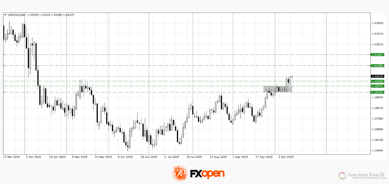 Новости о предстоящих тарифах способствовали выходу пары USD/CAD из среднесрочного диапазона 1.3930–1.3970. Цена не только пробила верхнюю границу коридора, но и закрепилась выше психологического уровня сопротивления 1.4000.