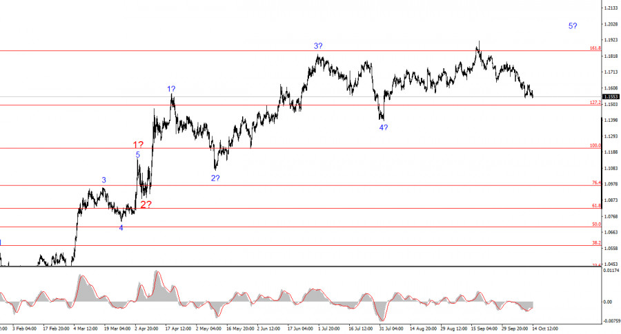 Волновая разметка 4-часового графика для инструмента EUR/USD преобразилась. Пока еще рано делать выводы об отмене повышательного участка тренда, но последнее снижение европейской валюты приведело к необходимости уточнения волновой разметки. Итак, теперь мы видим серию трехволновых структур a-b-c. Можно предположить, что они являются составной частью глобальной волны 4 повышательного участка тренда. В этом случае волна 4 приняла неестественно протяженный вид, но в целом волновая разметка сохраняет свою целостность. Построение повышательного участка тренда продолжается, а новостной фон продолжает поддерживать по большей части не доллар. Торговая война, начатая Дональдом Трампом, продолжается. Противостояние с ФРС продолжается. «Голубиные» ожидания рынка по ставке ФРС растут. В Америке продолжается «шатдаун». Рынок крайне невысоко оценивает результаты первых 7-8 месяцев Дональда Трампа, хоть экономический рост во втором квартале и составил почти 4%. На мой взгляд, построение повышательного участка тренда не завершено. Его цели разбросаны вплоть до 25-й фигуры. Исходя из этого, европейская валюта может снижаться еще некоторое время, не имея для этого никаких оснований(как в последние две недели). Но волновая разметка все равно будет сохранять свою целостность.
