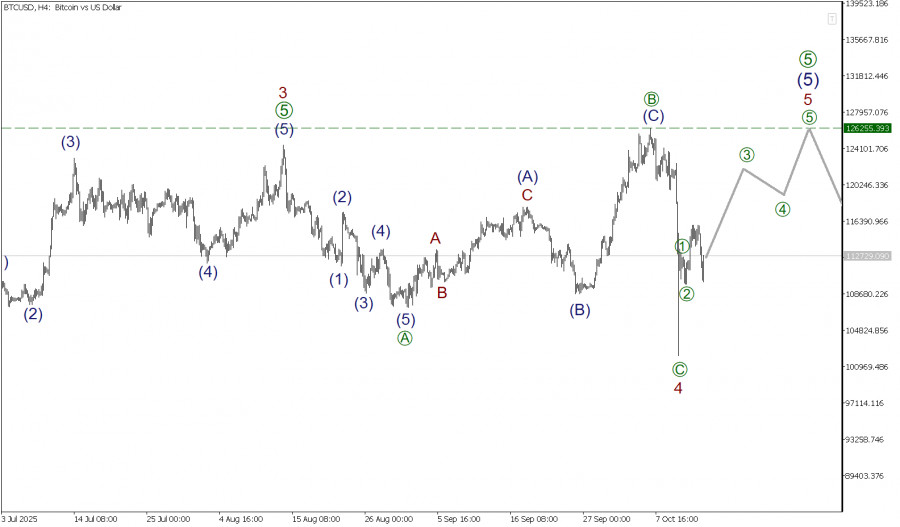 В долгосрочной перспективе по криптовалютной паре BTC/USD может формироваться крупный бычий импульс 1-2-3-4-5. Большая часть указанной фигуры полностью завершена. На текщем графике представлена разметка крупной коррекции 4, она имеет форму стандартного зигзага [A]-[B]-[C], где коррекция [B] приняла форму волновой плоскости (A)-(B)-(C). На последнем участке графика может формироваться начальная часть бычьего импульса 5, который будет состоять из подволн [1]-[2]-[3]-[4]-[5]. Скорее всего, первые две подволны [1]-[2] уже построены. В ближайшее время ожидается развитие подволн [3]-[4]-[5]. Большая вероятность, что быки нацелены на преддщий максимум 126255.43, который отметила коррекция [B]. В текущей ситуации можно рассматривать открытие длинных позиций. С целью забрать прибыль на окончании бычьего импульса. Торговые рекомендации: buy 112729.09, takeprofit 126255.43.