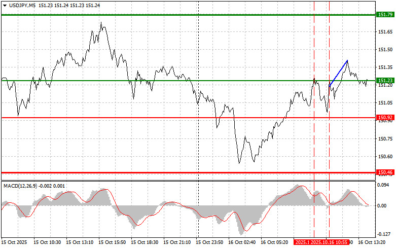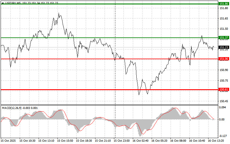 Разбор сделок и советы по торговле японской иенойТест цены 151.23 в первой половине пришелся на момент, когда MACD много прошел вверх от нулевой отметки, что ограничивало восходящий потенциал пары. По этой причине я не покупал доллар. Спустя некоторое время состоялся еще один тест 151.23 и состоялся он при нужных условиях начала движения индикатора MACD вверх от нулевой отметки, что стало подтверждением правильной точки входа на покупку доллара. В результате пара выросла на 20 пунктов. Во второй половине дня акцент будет смещен на цифры по производственному индексу ФРС-Филадельфии, а также на выступления членов FOMC Кристофера Уоллера и Майкла С. Барра. Мягкий тон политиков приведет к еще одной волне падению пары USD/JPY. Индекс ФРС-Филадельфии, выступающий барометром промышленной активности, станет первым индикатором настроений. Превышение прогнозов укрепит позиции доллара, в то время как провал станет предвестником снижения. Однако ключевым фактором влияния останутся выступления Уоллера и Барра. Их высказывания, касающиеся инфляции и дальнейшей траектории процентных ставок, приобретут исключительную значимость. Рынок будет чутко реагировать на любые намеки, способные пролить свет на будущие решения ФРС. "Мягкий тон" – вот что станет решающим сигналом для очередной волны снижения USD/JPY. Если политики продемонстрируют склонность к снижению ставок это еще больше подорвет привлекательность доллара как актива-убежища. Инвесторы начнут переоценивать свои позиции, что приведет к массированному сбросу USD в пользу JPY.Что касается внутридневной стратегии, то больше буду опираться на реализацию сценариев №1 и №2.Сигнал на покупкуСценарий №1: покупать USD/JPY сегодня планирую при достижении точки входа в районе 151.37 (зеленая линия на графике) с целью роста к уровню 151.86 (более толстая зеленая линия на графике). В районе 151.86 буду выходить из покупок и открывать продажи в обратную сторону (расчет на движение в 30-35 пунктов в обратную сторону от уровня). Рассчитывать на рост пары можно в продолжение восходящей тенденции. Важно! Перед покупкой, убедитесь в том, что индикатор MACD находится выше нулевой отметки и только начинает свой рост от нее.Сценарий №2: покупать USD/JPY сегодня также планирую в случае двух подряд тестов цены 151.06 в момент, когда индикатор MACD будет находиться в области перепроданности. Это ограничит нисходящий потенциал пары и приведет к обратному развороту рынка вверх. Можно ожидать рост к противоположным уровням 151.37 и 151.86.Сигнал на продажу Сценарий №1: продавать USD/JPY сегодня планирую после обновления уровня 151.06 (красная линия на графике), что приведет к быстрому снижению пары. Ключевой целью продавцов будет уровень 150.61, где буду выходить из продаж, а также открывать сразу покупки в обратную сторону (расчет на движение в 20-25 пунктов в обратную сторону от уровня). Давление на пару может вернуться при голубиной позиции представителей ФРС. Важно! Перед продажей, убедитесь в том, что индикатор MACD находится ниже нулевой отметки и только начинает свое снижение от нее. Сценарий №2: продавать USD/JPY сегодня также планирую в случае двух подряд тестов цены 151.37 в момент, когда индикатор MACD будет находиться в области перекупленности. Это ограничит восходящий потенциал пары и приведет к обратному развороту рынка вниз. Можно ожидать снижения к противопол