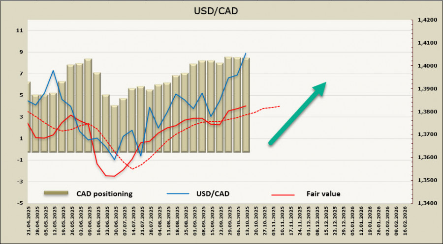 Отчет по занятости в сентябре вышел неожиданно сильным, общее количество новых рабочих мест выросла сразу на 60 тыс., что довольно много для Канады и значительно превышает прогноз в 5 тыс. Рост средней заработной платы составил остался на прежнем уровне 3.6%, как и уровень безработицы, в то же время количество отработанных часов снизилось на 0.2% м/м, а в целом за квартал рост составил всего 0.4%, что дает основания ожидать слабого ВВП в 3 квартале. Тем не менее сентябрьские показатели заметно превысили слабые данные за август, и Банк Канады должен учитывать эти данные в выработке своих дальнейших действий. Ближайшее заседание состоится в конце месяца, и пока всё указывает на то, что очередное снижение будет отложено. Базовая инфляция ниже таргета, высокий уровень безработицы указывает на то, что в экономике сохраняются значительные резервы, и чтобы BoC решился на еще одно снижение, необходимо, чтобы отчет по инфляции за сентябрь, который выйдет 21 октября, показал заметное замедление роста цен. Бюджетное управление Конгресса США опубликовало обзор бюджета за сентябрь. Ожидается, что дефицит федерального бюджета в 2025 финансовом году составил 1,8 трлн, что всего на 8 млрд меньше дефицита в 2024 г. Очевидно, что повышенные тарифы пока не дали никакого результата, и, по славам главы Казначейства Бассента, приостановка работы правительства начинает сказываться в сторону замедления экономики. Ситуация на валютном рынке выглядит спокойной в ожидании встречи Трампа и Си, по результатам которой станет ясно, ждать или нет нового витка торговой эскалации между США и Китаем. Пока очевидного драйвера нет, заседание ФРС состоится уже после встречи, поэтому ожидаем снижения волатильности и торговли преимущественно в боковом диапазоне. В отсутствии данных CFTC расчетная цена продолжает удерживаться выше долгосрочной средней, признаков разворота на юг пока нет.