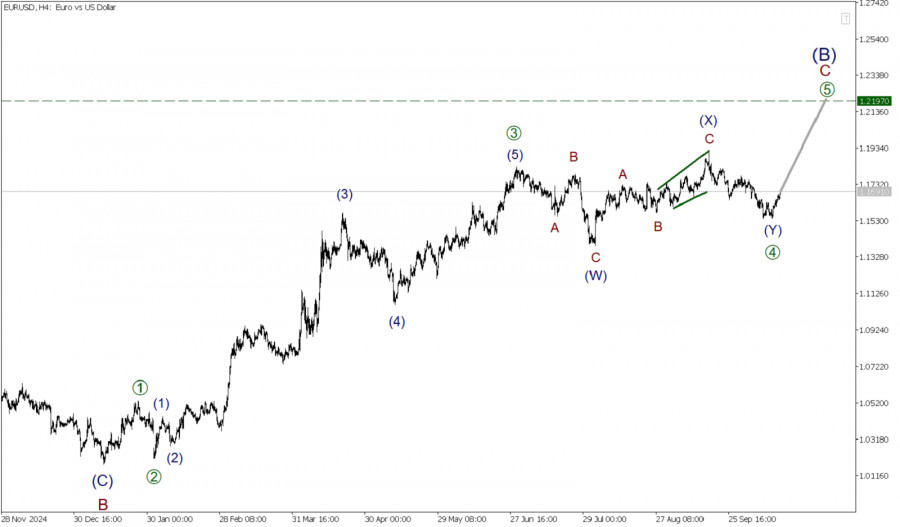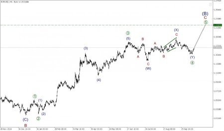 Рынок по Евродоллару в долгосрочной перспективе может формировать крупную бычью коррекция (B), которая принимает форму стандартного зигзага A-B-C. На сегодняшний день полностью завершены только первые две его части - импульс A и коррекция B. На последнем участке графика мы можем наблюдать развитие бычьей волны C, которая, по всей видимости, принимает форму импульса. На текущий момент завершены первые четыре его части - подволны [1]-[2]-[3]-[4]. В процессе построения ,бычья финальная подволна [5]. Большая вероятность, что быки внутри волны [5] смогут отправить рынок в область уровня 1.219. На указанной отметке величина крупной импульсной волны [5] составит 50% по расширению Фибоначчи от предыдущей импульсной волны [3]. Таким образом, при продолжении роста, стоит рассмотреть открытие длинных позиций с текущего уровня, с целью забрать прибыль на указанной отметке. После достижения уровня 1.219, ожидается смена тренда, а именно ожидается развитие финального медвежьего импульса (C). В текущей ситуации рекомендуется рассматривать открытие длинных позиций. Торговые рекомендации: Buy 1.169, takeprofit 1.219