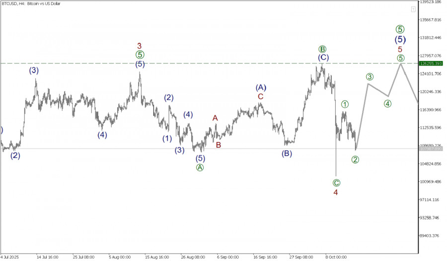 FxSignal 16-10-2025, 23:04 25 Аналитика, прогнозы валютного рынкаВ долгосрочной перспективе по криптовалютной паре BTC/USD может формироваться крупный бычий импульс 1-2-3-4-5. Большая часть указанной фигуры полностью завершена. На текщем графике представлена разметка крупной коррекции 4, она имеет форму стандартного зигзага [A]-[B]-[C], где коррекция [B] приняла форму волновой плоскости (A)-(B)-(C). На последнем участке графика может формироваться начальная часть бычьего импульса 5, который будет состоять из подволн [1]-[2]-[3]-[4]-[5]. Скорее всего, первые две подволны [1]-[2] уже построены. В ближайшее время ожидается развитие подволн [3]-[4]-[5]. Большая вероятность, что быки нацелены на преддщий максимум 126255.43, который отметила коррекция [B]. В текущей ситуации можно рассматривать открытие длинных позиций. С целью забрать прибыль на окончании бычьего импульса. Торговые рекомендации: buy 107987.89, takeprofit 126255.43.