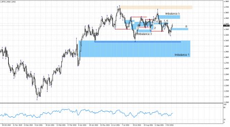 Пара GBP/USD резко выполнила разворот в пользу британца и начала процесс роста на этой неделе. В зоне разворота цены не было ни одного «бычьего» паттерна, что не позволяло пока трейдерам открывать сделки на покупку. Таким образом, если мы наблюдаем начало нового отрезка «бычьего» тренда, то трейдерам в любом случае нужно и дальше дожидаться отработки любого «бычьего» паттерна. На этой неделе был образован первый достойный паттерн – «бычий» имбаланс 8. Его отработка сверху может дать реакцию цены, которая затем приведет к новому росту.
