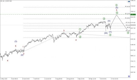 FxSignal 17-10-2025, 23:20 21 Аналитика, прогнозы валютного рынкаВ глобальной перспективе по индексу SP500 может формироваться крупный импульс (1)-(2)-(3)-(4)-(5). Подволна (1) и (2) сформированы. На последнем участке графика представлена восходящая импульсная волна (3), размеченная подволнами 1-2-3-4-5. В составе волны (3) завершенными смотрятся подволны 1-2-3-4. Коррекционная волна 4 не так давно подошла к концу и приняла форму двойного зигзага. На последнем участке цены мы можем наблюдать построение новой и финальной волны 5. Волна 5 может принять форму импульса [1]-[2]-[3]-[4]-[5]. Завершены подволны [1]-[2], и сейчас растем в более мощной подволне [3]. Вероятно, быки нацелены на предыдущий максимум 6864, на указанном уровне величина импульса 5 будет равна 100% по расширению Фибоначчи от волны 3. В текущей ситуации можно рассматривать открытие длинных позиций с целью забрать прибыль на завершении импульсного роста в районе предыдущего максимума. Торговые рекомендации: Buy 6664.64, takeprofit 6988.10.