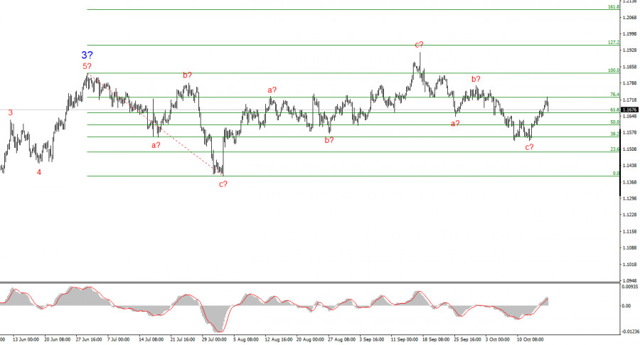 Курс инструмента EUR/USD в течение пятницы снизился на 20 базовых пунктов, что нельзя считать серьезным изменением. Сегодня новостной фон сводился только к политике, причем связанной только с США. «Шатдаун» в Америке продолжается, а многие аналитики заговорили о новом рекордном сроке остановки работы правительства и всех государственных структур, хотя еще неделю назад были уверены в том, что «шатдаун» продлится «пару недель». Однако Дональд Трамп продолжает стоять на своем, а демократы на своем. Голосование по бюджету в Сенате США уже начинает походить на казино, где игрок ставит на определенную ячейку в надежде, что на этот раз ему повезет. Так и республиканцы продолжают инициировать все новые и новые голосования в надежде на то, что им просто повезет. Демократы продолжают требовать сохранения всех медицинских и социальных программ для малообеспеченных слоев американского населения, которые по факту сильно урезал Дональд Трамп своим «Одним большим и прекрасным законом». Трамп и его команда продолжают стоять на своем – сначала одобрение бюджета, затем – переговоры о судсидиях. Однако верить Трампу – тоже самое, что верить в пришествие инопланетян. Весь мир из раза в раз становится свидетелем очередных обещаний президента США, которые не выполняются, а затем Трамп просто сообщает, что его неверно поняли или же что он просто пошутил. Под занавес недели доллар немного подправил свое положение, но в данное время уже могло начаться построение повышательной серии волн.Общие выводы.
