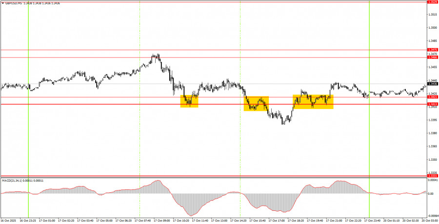 На 5-минутном ТФ в пятницу было сформировано три торговых сигнала. Все три – ложные, так как движения в течение дня были очень слабыми. Цена трижды формировала сигналы около области 1,3413-1,3421, но ни разу не прошла в нужном направлении даже 20 пунктов. Напомним, что какими бы хорошими ни были торговые сигналы, если волатильность на нуле, заработать не получится.Советуем ознакомиться с другими статьями автора: