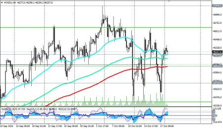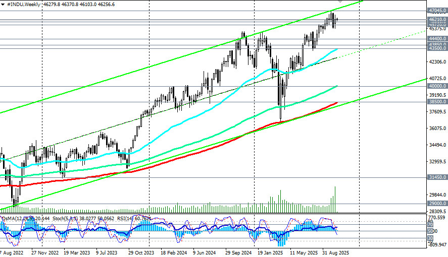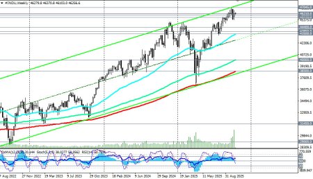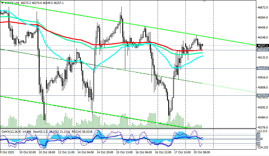 В то время, как индекс доллара USDX остается под давлением, фьючерсы на основные американские фондовые индексы показывают умеренный рост в начале недели. Инвесторы реагируют на сочетание ожиданий более мягкой политики ФРС и возможного улучшения торговых условий и торговых отношений между США и Китаем, отметили мы в нашем сегодняшнем фундаментальном анализе и обзоре «DJIA: на фоне смягчения торговой напряженности и ожиданий снижения ставок ФРС». Так, фьючерсы на американский промышленный индекс Dow Jones (сокращенно DJIA или INDU в торговом терминале) пытаются сегодня продолжить рост, начавшийся в период американской торговой сессии пятницы. В начале сегодняшней европейской торговой сессии фьючерсы DJIA приближались к отметке 46370.0, а на момент публикации данной статьи торговались вблизи отметки 46300.0, пытаясь более надежно закрепиться в зоне краткосрочного бычьего рынка – выше важного краткосрочного уровня поддержки 46210.0 (ЕМА200 на 1-часовом графике). Если напряженность на рынках продолжит спадать, то следует ждать возобновление глобальной восходящей динамики американского фондового рынка и его основных индексов, в частности индекса Dow Jones Industrial Average, также предположили мы в нашем недавнем обзоре DJIA: новые тарифные угрозы Трампа наносят удар по рынку. Несмотря на недавнее снижение, цена на фьючерсы Dow Jones Industrial Average остается в зоне бычьего рынка, среднесрочного - выше ключевых уровней поддержки 44400.0, 43850.0 (200-периодная скользящая средняя на дневном графике), долгосрочного – выше 40000.0, 38500.0 (200-периодная скользящая средняя на недельном графике). В случае возобновления роста первым сигналом для новых покупок может стать пробой сегодняшнего максимума 46370.0 и максимума четверга 46466.0, а ближайшей целью – недавний и рекордный максимум, достигнутый в начале месяца вблизи отметки 47045.0. В альтернативном сценарии и после пробоя уровня поддержки 46210.0 и сегодняшнего минимума 46103.0, снижение цены продолжится в сторону нижней границы восходящего канала на дневном графике и отметки 45720.0 (это также ЕМА50 на дневном графике). Более глубокая коррекция подразумевает снижение цены к зоне ключевых среднесрочных поддержек и уровней 44400.0 (ЕМА144 на дневном графике), 43850.0 (ЕМА200 на дневном графике), удерживающих индекс DJIA в зоне среднесрочного бычьего рынка. В основном сценарии ожидаем все же возобновление роста и обновление рекордных максимумов выше отметки 47045.00, если только Трамп или неожиданная резкая эскалация геополитической напряжённости в каком-нибудь из регионов мира вновь «не спутают все карты». Уровни поддержки: 46210.0, 46010.0, 45720.0, 44400.0, 43850.0, 43500.0 Уровни сопротивления: 46370.0, 46466.0, 46676.0, 47000.0, 47045.0, 48000.0 Торговые сценарии
