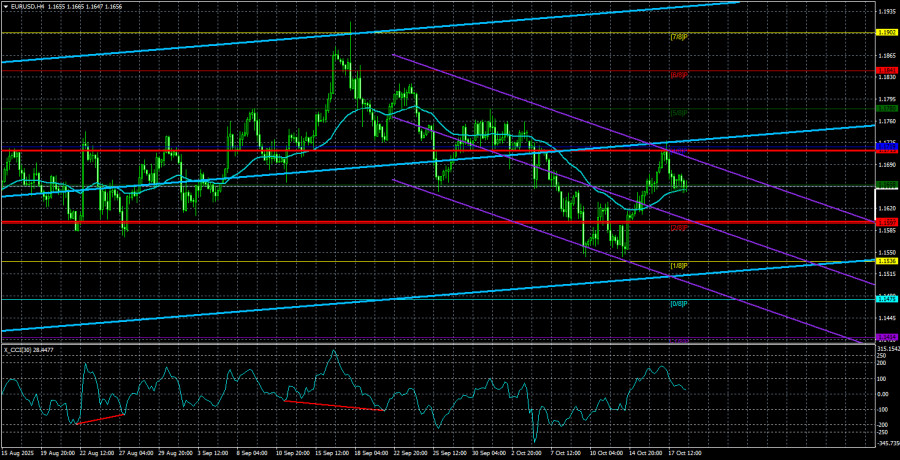 Валютная пара EUR/USD в течение понедельника торговалась со слабой волатильностью, что совершенно не удивительно, учитывая полное отсутствие макроэкономических и фундаментальных событий в течение дня. Волатильность была, как и прогнозировалось, низкая. Таким образом, ко всем ранее опубликованным статьям добавить, по сути, нечего. Доллар США, если показывает абсолютно любой рост, мы его считаем алогичным. И уж тем более в понедельник не было абсолютно никаких оснований для укрепления американской валюты, учитывая очередные беспорядки, митинги и протесты против Дональда Трампа в Америке. Таким образом, сегодня можно лишь рассмотреть грядущие события на этой неделе и попытаться предположить, чего ожидать? Сразу же хотим сказать, что выше мувинга мы ожидаем восходящее движение, а ниже – алогичное нисходящее. Звучит банально, но расшифровывается это приблизительно следующим образом. Если цена выше скользящей средней линии, то длинные позиции актуальны. Если цена располагается ниже мувинга, то торговать на понижение можно только с учетом понимания алогичности такого движения и его коррекционного статуса. Ключевым ТФ, на котором прекрасно видна текущая картина происходящего, остается дневной. Именно на нем прекрасно видно, что никакой коррекции(то есть роста доллара), по сути, нет. Есть флэт, который длится уже несколько месяцев. Поэтому в данное время мы даже не можем сказать, что американская валюта растет. Что касается наиболее важных событий на этой неделе, то это, конечно же, отчет по инфляции в США, который важен даже не столько из-за своего влияния на монетарную политику ФРС, сколько потому, что это чуть ли не единственный важный отчет, который будет опубликован в этом месяце. Напомним, что в Штатах продолжается «шатдаун», поэтому важнейших данных по рынку труда и безработице трейдеры не увидят до тех пор, пока демократы и республиканцы не сумеют прийти к соглашению. Среди других событий – выступления главы ЕЦБ Кристин Лагард, которая теоретически может прокомментировать последний отчет по инфляции в Евросоюзе. Только что комментировать? Инфляция выросла немного сильнее прогнозов, но что от этого меняется для ЕЦБ? Если инфляция растет, значит ставку снижать нельзя, а об ужесточении монетарной политики сейчас и речи идти не может. В пятницу в ЕС выйдут отчеты по деловой активности в секторах услуг и производства за октябрь, но это не самые важные показатели, которые к тому же нечасто радуют резонансными значениями. Таким образом, на этой неделе следует пристально следить за риторикой Трампа в отношении Китая, за отчетом по инфляции и, по большому счету, все. С нашей точки зрения, новое падение пары не невозможно, так как тот же дневной ТФ вполне допускает падение в рамках флэта еще пунктов на 150. Но пока, с технической точки зрения, не начнется нисходящий тренд, мы бы никому не стали советовать продажи пары. Средняя волатильность валютной пары EUR/USD за последние 5 торговых дней по состоянию на 21 октября составляет 57 пунктов и характеризуется, как «средняя». Мы ожидаем движение пары между уровнями 1,1599 и 1,1713 во вторник. Старший канал линейной регрессии направлен вверх, что по-прежнему указывает на восходящую тенденцию. Индикатор CCI заходил в область перепроданности, что может спровоцировать новый виток восходящего тренда. Ближай
