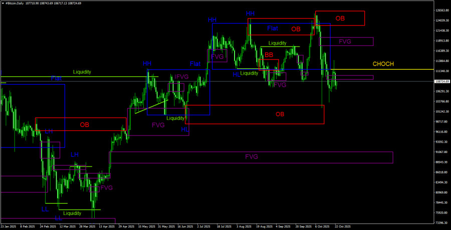 Биткоин сломал восходящую структуру на дневном ТФ и впервые за 3 года может сформировать полноценный нисходящий тренд. Цена вернулась в боковой канал, сформировала новый «медвежий» OB, еще раз пробила верхнюю границу флэта, еще раз обновила ATH, сняла ликвидность с предыдущего ATH и обвалилась на 23 000$. Мы предполагали, что целью падения будет выступать «бычий» OB в области 98 000$ - 102 700$. Цель отработана. Теперь стоит ожидать нового падения с целью 91 100$(последний неотработанный «бычий» FVG). Очевидных областей POI на продажу в данное время нет ни на 4-часовом ТФ, ни на дневном. Таким образом, нужно ждать формирования новых «медвежьих» паттернов.Пояснения к иллюстрациям: