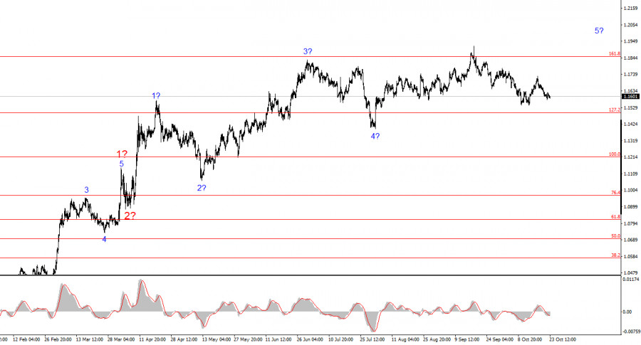 Волновая разметка 4-часового графика для инструмента EUR/USD преобразилась и, к сожалению, не в лучшую сторону. Пока еще рано делать выводы об отмене повышательного участка тренда, но последнее снижение европейской валюты привело к необходимости уточнения волновой разметки. Итак, теперь мы видим серию трехволновых структур a-b-c. Можно предположить, что они являются составной частью глобальной волны 4 повышательного участка тренда. В этом случае волна 4 приняла неестественно протяженный вид, но в целом волновая разметка сохраняет свою целостность. Построение повышательного участка тренда продолжается, а новостной фон продолжает поддерживать по большей части не доллар. Торговая война, начатая Дональдом Трампом, продолжается. Противостояние с ФРС продолжается. «Голубиные» ожидания рынка по ставке ФРС растут. В Америке продолжается «шатдаун». Рынок крайне невысоко оценивает результаты первых 9 месяцев Дональда Трампа, хоть экономический рост во втором квартале и составил почти 4%. На мой взгляд, построение повышательного участка тренда не завершено, а его цели разбросаны вплоть до 25-й фигуры. Исходя из этого, европейская валюта может снижаться еще некоторое время, не имея для этого никаких оснований(как в последние три недели), но волновая разметка все равно будет сохранять свою целостность.