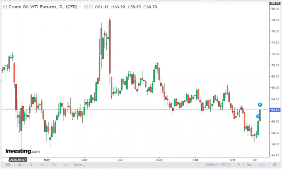 Санкции против нефтяных компаний России: Правительство США объявило о введении новых санкций против крупнейших российских производителей нефти, таких как Роснефть и Лукойл, производящих более 5 млн баррелей в день. Эксперты считают, что это приведет к росту цен на нефть марки WTI, достигнувших сегодня отметки выше 62.00 долларов за баррель, поскольку российские производители занимают значительную долю мирового рынка нефти.