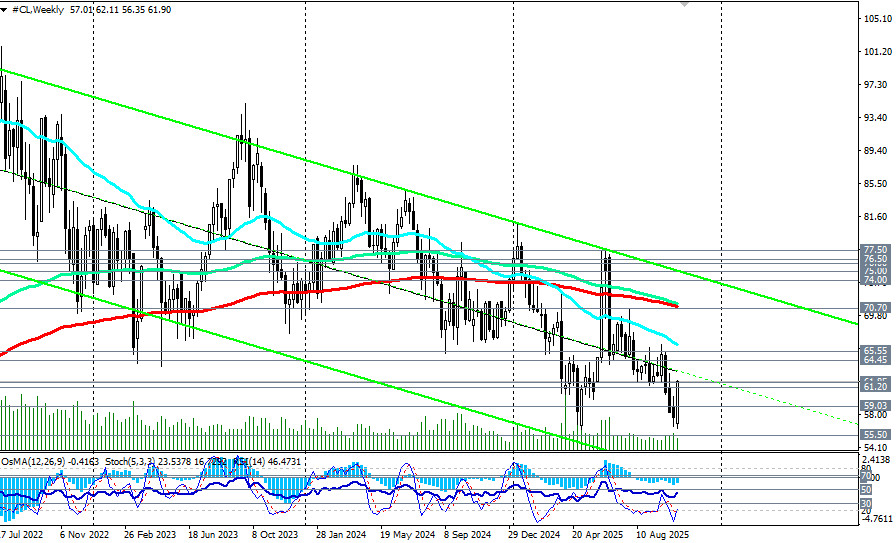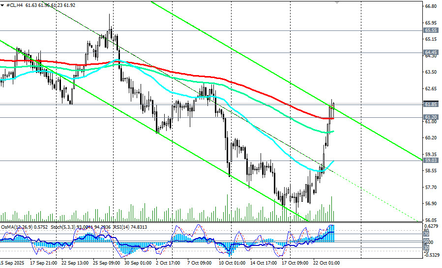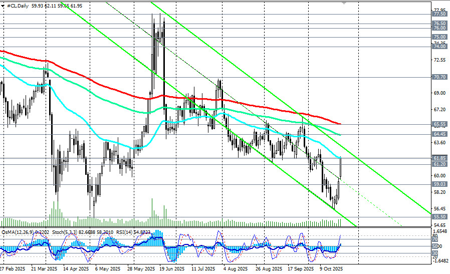 Таким образом, сегодняшняя ситуация на мировых рынках характеризуется высоким уровнем неопределённости и ожиданием значимых экономических данных, особенно индекса потребительских цен (CPI) в США, который может оказать значительное влияние на дальнейшее развитие рынков (см. также наш сегодняшний обзор «[i]GBP/USD: умеренно-негативные перспективы»). В то же время, несмотря на обещания президента Дональда Трампа заключить сделку с Китаем, участники рынка сохраняют осторожность перед предстоящими важными публикациями. Что ещё важно учитывать? Участники рынка внимательно следят за реакцией Китая и Индии, являющихся основными покупателями российской нефти, на введение американских санкций. Отчёт по инфляции в США (в пятницу) станет одним из ключевых факторов, определяющих направление дальнейшего развития американской экономики и денежно-кредитной политики ФРС. Кроме того, завтра будут опубликованы предварительные индексы PMI по ключевым экономикам мира – Германии, Еврозоны, Великобритании, США. Завтрашний день, таким образом, обещает стать важным этапом для оценки перспектив экономического роста и формирования инвестиционного климата на ближайшие месяцы. Между тем, так называемый «индекс страха и жадности» упорно держится в районе «страха», а сегодня – почти на границе с зоной «экстремального страха» и на отметке 28 (из 100 баллов). Почти две недели индикатор колеблется ниже нейтральных отметок. Это говорит о том, что инвесторы не оправились от обвала рынка 10 октября и больше склоняются к продажам рискованных активов, чем к их покупкам. Техническая картина Так или иначе, сегодня американские фондовые индексы остаются, в основном, в диапазонах, чего не скажешь о ценах на нефть. Так, цена нефти марки WTI (#CL в торговом терминале) после роста в предыдущие 3 торговых дня сегодня пробила отметку 62.00, а на момент публикации данной статьи находится вблизи отметки 61.85, через которую проходит важный уровень сопротивления (ЕМА50 на дневном графике). Несмотря на этот рост, цена остается в зоне медвежьего рынка, ниже ключевых уровней сопротивления 65.55 (ЕМА200 на дневном графике), 70.70 (ЕМА200 на недельном графике). Ввиду этого, зона вблизи уровня сопротивления 61.85 может рассматриваться как возможность новых продаж. Одних санкций против России и ее партнёров все же, вероятно, недостаточно, чтобы переломить текущую негативную ситуацию, связанную с торговыми войнами, несущих угрозу мировой экономике. Пробой краткосрочного уровня поддержки 61.20 (ЕМА200 на 4-часовом графике) может стать подтверждающим сигналом к возобновлению коротких позиций по нефти WTI.Материал предоставлен компанией InstaForex - www.instaforex.com