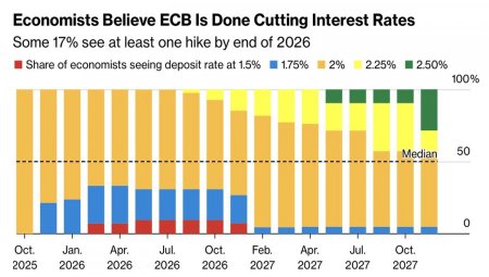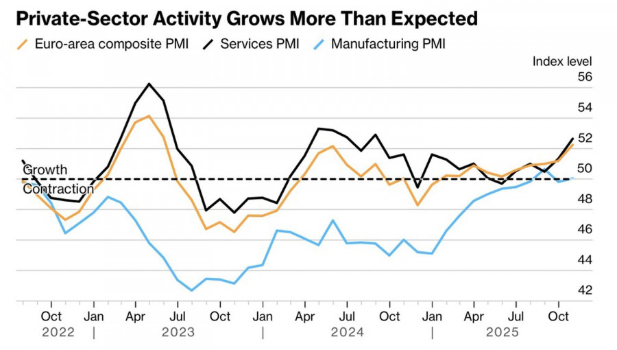Динамика европейской деловой активностиВ октябре композитный индекс менеджеров по закупкам валютного блока взлетел до 52,2, максимальной отметки с мая 2024. До этого многие хоронили экономику еврозоны. Высокие тарифы США, непрекращающийся вооруженный конфликт в Украине и сомнения в способности Германии реализовать фискальные стимулы никак не помогали EUR/USD. Скорее мешали. Однако неожиданный взлет PMI – это совсем другая история. Как экономика адаптируется к пошлинам на импорт и верит в Фридриха Мерца. Почему бы не поверить и евро?Тем временем опрос экспертов Bloomberg убедил, что ЕЦБ завершил цикл ослабления денежно-кредитной политики. Большинство респондентов считают, что ставка по депозитам останется на отметке 2% до 2027. Треть экономистов все еще видят одно сокращение, а 17% прогнозируют один или несколько актов монетарной рестрикции в 2026. Прогнозы по ставке по депозитам ЕЦБЭкономика еврозоны устойчива, а ставки Европейского центробанка падать не собираются. Такие аргументы используют «быки» по EUR/USD для атак. И правильно делают. Их оппонентам могла бы помочь статистика по американской инфляции. Не помогла. Потребительские цены и базовый индикатор в сентябре выросли на 3%, не дотянув до прогнозов экспертов Bloomberg в 3,1% г/г. Базовый CPI в месячном исчислении прибавил всего 0,2%. Речь идет о самом медленном расширении индикатора за последние три месяца. Такая динамика инфляции открывает ФРС дверь для снижения ставки по федеральным фондам не только в октябре, но и в декабре. Это обстоятельство оказывает давление на доллар США и позволяет EUR/USD двигаться на север. Расхождение в монетарной политике ЕЦБ и ФРС, а также дивергенция в экономическом росте - классические драйверы курсообразования на Forex. Чаще всего они проявляют себя на спокойном рынке, а после потрясений из-за введения Дональдом Трампом 100%-х тарифов против Китая финансовые рынки действительно успокоились. Да, впереди новые бури, однако пока евро берет «быков» за рога. Найдет ли доллар США силы ему сопротивляться? Поживем – увидим. Технически на дневном графике EUR/USD имеет место тест динамических сопротивлений в виде скользящих средних в рамках реализации разворотного паттерна 1-2-3. Успех «быков» в этом мероприятии позволит нарастить сформированные от 1,1615 лонги. Материал предоставлен компанией InstaForex - www.instaforex.com