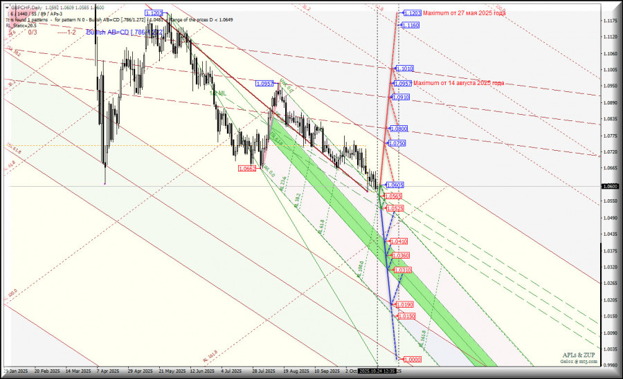Операционный масштаб Minor (таймфрейм Daily)GBP/CHF - Daily - обзор вариантов развития движения данного валютного инструмента c 27 октября 2025 г.Предыдущий обзор GBP/CHF (таймфрейм h4 ) от 22.10.2025 г. 16:28____________________Great Britain Pound vs Swiss FrancРазвитие движения GBP/CHF - Daily с 27 октября 2025 года продолжится в зависимости от отработки и направления пробоя границ канала 1/2 Median Line (1.0525 - 1.0565 - 1.0605) вил младшего операционного масштаба Minute-h4.Нисходящее движение.При пробое уровня поддержки 1.0525 на нижней границе канала 1/2 Median Line Minute-h4 нисходящее движение данного кросс инструмента будет направлено к зоне равновесия (1.0410 - 1.0360 - 1.0310) вил младшего операционного масштаба Minute-h4 с вариантом достижения верхней границы ISL38.2 (1.0190) зоны равновесия вил старшего операционного масштаба Minor-Daily.Восходящее движение. случае пробоя верхней границы канала 1/2 Median Line (уровень сопротивления 1.0605) вил младшего операционного масштаба Minute-h4 станет возможным продолжение развития восходящего движения Great Britain Pound vs Swiss Franc к начальной линии SSL Minor-Daily (1.0750) и к границам канала 1/2 Median Line (1.0800 - 1.0910 - 1.1010) вил старшего операционного масштаба Minor-Daily с учетом отработки maximum 1.0957 от 14 августа 2025 года.____________________Обзор составлен без учета новостного фона, открытия торговых сессий основных финансовых центров и не является руководством к действию (выставления ордеров "sell" или "buy").Формула расчета индекса доллара: