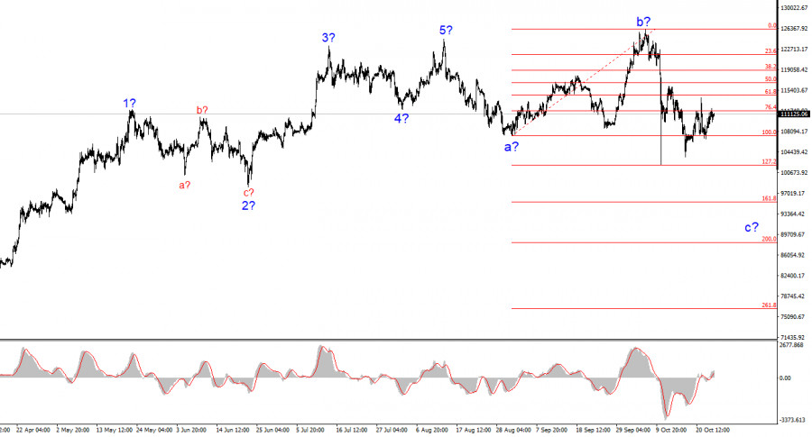 Исходя из проведенного анализа BTC/USD, я по-прежнему считаю, что построение повышательной структуры завершено. Если это предположение неверно, я в любом случае будут ожидать понятной коррекционной структуры прежде, чем рассматривать покупки. Новостной фон не был причиной резкого роста биткоина в последние месяцы, он также не был причиной последнего краха. Биткоин четырежды не сумел преодолеть отметку 122000$, каждый подход к ней сопровождался довольно сильным падением. Исходя из всего вышесказанного, я ожидаю, что коррекционная волна с примет более протяженный и сложный вид, а биткоин продолжит снижение с целями 102000$ и 95400$, что соответствует 127,2% и 161,8% по Фибоначчи.Основные принципы моего анализа: