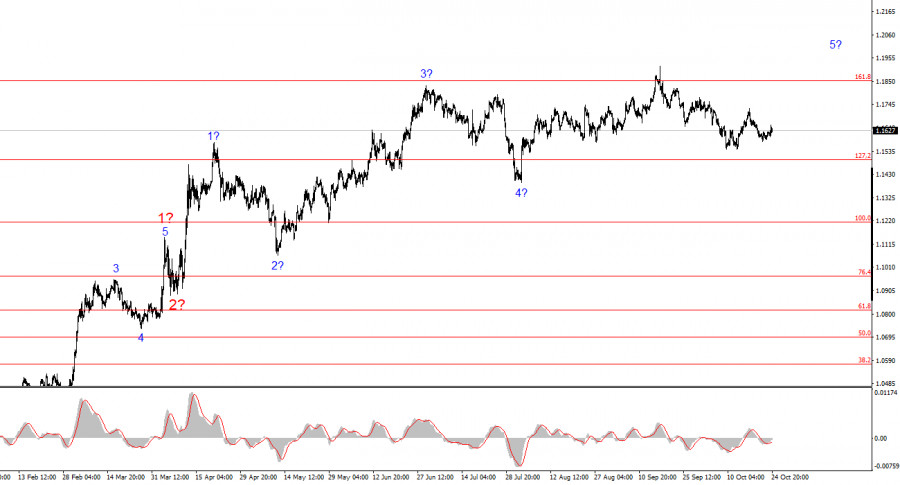 Исходя из проведенного анализа EUR/USD, я делаю вывод, что инструмент продолжает построение повышательного участка тренда. Сейчас на рынке сложилась пауза, но политика Дональда Трампа и ФРС остаются весомыми факторами падения американской валюты. Цели текущего участка тренда могут простираться вплоть до 25-й фигуры. В данное время мы можем наблюдать построение коррекционной волны 4, которая принимает очень сложный и протяженный вид. Следовательно, в ближайшее время я по-прежнему рассматриваю только покупки. До конца года я жду повышения евровалюты к отметке 1,2245, что соответствует 200,0% по Фибоначчи. На меньшем масштабе виден весь повышательный участок тренда. Волновая разметка не самая стандартная, так как коррекционные волны имеют разные размеры. К примеру, старшая волна 2 меньше по размеру, чем внутренняя волна 2 в 3. Однако такое тоже случается. Напомню, что лучше всего вычленять на графиках понятные структуры, а не обязательно привязываться к каждой волне. Сейчас повышательная структура практически не вызывает вопросов.Основные принципы моего анализа: