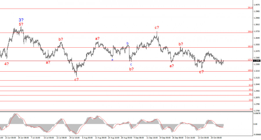 Исходя из проведенного анализа EUR/USD, я делаю вывод, что инструмент продолжает построение повышательного участка тренда. Сейчас на рынке сложилась пауза, но политика Дональда Трампа и ФРС остаются весомыми факторами падения американской валюты. Цели текущего участка тренда могут простираться вплоть до 25-й фигуры. В данное время мы можем наблюдать построение коррекционной волны 4, которая принимает очень сложный и протяженный вид. Следовательно, в ближайшее время я по-прежнему рассматриваю только покупки. До конца года я жду повышения евровалюты к отметке 1,2245, что соответствует 200,0% по Фибоначчи. Волновая картина по GBP/USD: