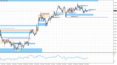 С графической точки зрения, имбаланс 7 – это сейчас фактически единственный паттерн, интересный для трейдеров. Так как движения в последние недели на рынке очень слабые, сразу и не поймешь, как именно цена отреагировала на имбаланс 7, изначально «бычий» имбаланс. «Бычьей» реакции на него она не получила, затем закрылась ниже него, но не инвалидировала. А в последние несколько дней находится аккурат внутри зоны шириной всего лишь 30 пипсов. На мой взгляд, сделать вывод о новом падении евро можно сейчас только на основании возможного падения британца, но никак не на основании графического анализа или же имбаланса 7. Этот паттерн может еще превратиться в «перевернутый имбаланс», но тогда сейчас медведи должны на него отреагировать. Напомню также, что причин у быков начать новое наступление имеется в достатке уже несколько недель подряд. Это и «голубиные» перспективы ДКП FOMC, это и общая политика Дональда Трампа, это и противостояние США с Китаем, это и акции протеста против Трампа, захлестнувшие Америку в третий раз в текущем году, это и слабость рынка труда, это и не радужные перспективы американской экономики, это и «шатдаун», который длится уже почти месяц. Однако быки продолжают выжидать, а графических сигналов к покупкам все равно нет. Таким образом, графический анализ остается сейчас на первом месте для трейдеров. Имбаланс 3 продолжает притягивать к себе цену. Имбаланс 7 – может быть преображен в «перевернутый медвежий имбаланс». В любом случае реакции на имбаланс 7 получено не было, а значит и открывать сделки на покупку оснований тоже не было. Таким образом, ждем европейскую валюту еще ниже и реакции на имбаланс 3. Или же образования новых «бычьих» паттернов. Тренд остается «бычьим», а движения в последние несколько месяцев – это боковик. Таким образом, графический анализ в данное время не позволяет рассматривать сделки на продажу. Не следует упускать из виду торговую войну Трампа и его давление на FOMC. В данное время Трамп активно требует от Китая и Индии отказа от российской нефти в рамках компании по завершению войны в Украине. Против Индии Трамп уже повысил пошлины до 50%, а с Китаем вроде бы достигнуты некоторые договоренности, но новая эскалация – это вопрос времени. Вряд ли такой информационный плацдарм поможет медведям сформировать тренд. Таким образом, в «медвежий» тренд я по-прежнему не верю. Информационный фон, во-первых, крайне сложно интерпретировать в пользу доллара, а во-вторых, он попросту не изменился в последнее время, чтобы ожидать резкую смену в настроении трейдеров. Синяя линия показывает ценовой уровень, ниже которого можно будет считать «бычий» тренд завершенным. До него медведям нужно пройти вниз еще около 220 пипсов, а у меня даже текущее падение вызывает нешуточное удивление. Ближайшей целью для роста европейской валюты может выступать только «медвежий» имбаланс 1,1976 – 1,2092 на недельном графике, который был образован еще в июне 2021 года. Календарь новостей для США и Евросоюза: США – Решение FOMC по ДКП (18-00 UTC). США – Пресс-конференция ФРС (18-30 UTC). 29 октября календарь экономических событий содержит в себе две записи, но обе – очень важные. Влияние информационного фона на настроение рынка в среду вечером будет очень сильным. Прогноз по EUR/USD и советы трейдерам: На мой взгляд, пара может находиться на завершающем э