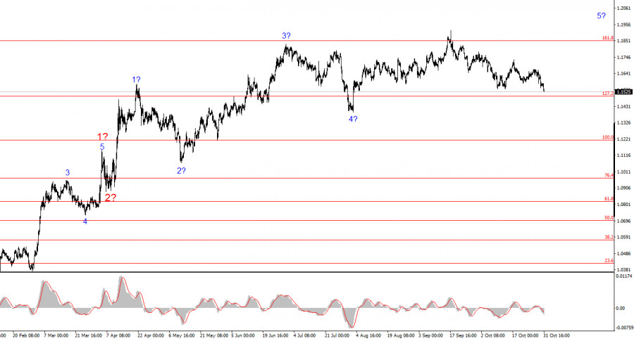 Волновая разметка 4-часового графика для инструмента EUR/USD преобразилась и, к сожалению, не в лучшую сторону. Пока еще рано делать выводы об отмене повышательного участка тренда, но последнее снижение европейской валюты привело к необходимости уточнения волновой разметки. Итак, теперь мы видим серию коррекционных структур. Можно предположить, что они являются составной частью глобальной волны 4 повышательного участка тренда. В этом случае волна 4 приняла неестественно протяженный вид, но в целом волновая разметка сохраняет свою целостность. Построение повышательного участка тренда продолжается, а новостной фон продолжает поддерживать по большей части не доллар. Торговая война, начатая Дональдом Трампом, продолжается. Противостояние президента с ФРС продолжается. «Голубиные» ожидания рынка по ставке ФРС остаются высокими, особенно на 2026 год. В Америке продолжается «шатдаун». Рынок труда «охлаждается». На мой взгляд, построение повышательного участка тренда не завершено, а его цели разбросаны вплоть до 25-й фигуры. Исходя из этого, европейская валюта может снижаться еще некоторое время, не имея для этого веских оснований(как в последний месяц), но волновая разметка все равно предполагает повышательный участок тренда.