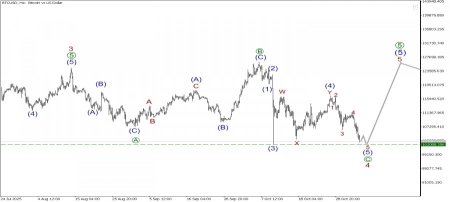 Предполагается, что по криптовалютной паре BTC/USD в глобальной перспективе может формироваться крупный бычий импульс 1-2-3-4-5. Большая часть указанной фигуры полностью завершена. На текущем графике представлена разметка боковой коррекции 4, которая может принять форму волновой плоскости [A]-[B]-[C].Две коррекционные волны [A]-[B] уже завершены, где [B] - волновая плоскость меньшего волнового уровня. Сейчас в процессе построения может находиться заключительная импульсная волна [C]. Внутри медвежьего импульса завершены четыре части - подволны (1)-(2)-(3)-(4). В настоящее время формируется финальная импульсная волна (5).Предполагается, что цена в импульсе (5) может упасть к предыдущему минимуму 103493.00. Ранее на указанной отметке была завершена волна связка X, входящая в коррекционную волну (4).В текущей ситуации можно рассматривать открытие коротких позиций с целью забрать прибыль на завершении коррекционной волны 4Торговые рекомендации: Sell 102860.00, takeprofit 102088.35.Материал предоставлен компанией InstaForex - www.instaforex.com