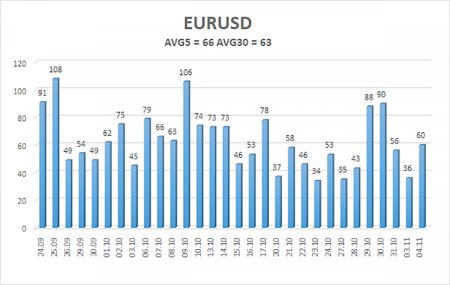 Валютная пара EUR/USD в течение вторника угадайте, что? Правильно! Вновь торговалась с минимальной волатильностью и в нисходящем русле. На этот раз всех собак можно повесить на Кристин Лагард. Ведь ее утреннее выступление было единственным событием дня. Неважно, что госпожа Лагард вообще не затрагивала тему монетарной политики, а говорила больше о переходе Болгарии на евровалюту и возможном регулировании криптовалютного рынка ЕЦБ. Аналитикам, трейдерам и экспертам сейчас это все неважно. Важно, чтобы был повод продать евро и купить доллар. Почему? Тоже неважно. Таким образом, европейская валюта продолжает скатываться вниз при полном отсутствии фундаментальных и макроэкономических оснований. Индикатор CCI уже «устал» заходить в область перепроданности и рисовать «бычьи» дивергенции, европейская валюта падает даже в те дни, когда новостей нет вообще никаких, а эксперты продолжают придумывать причины, которые объясняют укрепление доллара США. Одной из наиболее распространенных версий сейчас является – слабость европейской экономики и недостаточно «голубиный» настрой ФРС. С нашей точки зрения, эти две причины звучат, как абсурд. Однако, на рынке сколько людей, столько и мнений. Мы не говорим, что другие участники рынка не верны в своих выводах, но мы не считаем эти причины «причинами». Мы по-прежнему считаем, что текущее движение вниз не имеет под собой никаких реальных фундаментальных и макроэкономических оснований, поэтому оно является алогичным. Европейская экономика из года в год показывает слабые темпы рост на протяжении уже 10-15 лет. Это явно не причина нынешнего обесценивания европейской валюты в то время, как весь список причин для падения доллара не поместится на лист A4. Ведь основная проблема заключается не в том, что доллар растет без оснований. Основная проблема заключается в том, что доллар растет тогда, когда присутствует огромное количество оснований для его падения. Что касается «недостаточно «голубиного» настроя ФРС», то эта фраза даже звучит немного смешно. Напомним, что осенью ЕЦБ завершил цикл смягчения монетарной политики, Банк Англии взял недавно паузу на неопределенный срок из-за высокой инфляции, а ФРС уже дважды снизила ключевую ставку. И это в любом случае лишь самое начало. Даже если в декабре будет принято решение не снижать ставку в третий раз подряд, что это поменяет? Дональд Трамп перестанет требовать смягчения монетарной политики? Дональд Трамп перестанет пытаться уволить всех «ястребов» из состава Комитета FOMC? Джером Пауэлл в мае следующего года не уйдет в отставку? Мы считаем, что дорога у ФРС теперь только одна – вниз. Вопрос лишь в том, какими темпами будет падать ключевая ставка. И даже ответ на этот вопрос не имеет особого значения, потому что ЕЦБ и БА в то же время будут только сохранять текущие параметры монетарной политики. Таким образом, мы продолжаем считать текущее укрепление американской валюты полностью алогичным. А помимо этого, в большинстве случаев мы наблюдаем дневную волатильность около 40-50 пунктов... Средняя волатильность валютной пары EUR/USD за последние 5 торговых дней по состоянию на 5 ноября составляет 66 пунктов и характеризуется, как «средняя». Мы ожидаем движение пары между уровнями 1,1427 и 1,1559 в среду. Старший канал линейной регрессии направлен вбок, сигнализируя о флэте. 