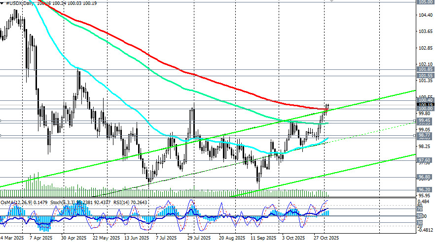 Экономисты подчеркивают необходимость осторожности, так как более значительное повышение стоимости доллара может вызвать негативные последствия для мировой экономики. В то же время, другая часть экономистов считают, что потенциал укрепления доллара все еще существует. Техническая картинаПробив во вторник психологически значимый уровень сопротивления 100.00 (это также ключевой среднесрочный уровень сопротивления и 200-периодная скользящая средняя на дневном графике), цена на фьючерсы индекса доллара USDX продолжила рост, достигнув в начале сегодняшней европейской торговой сессий нового локального максимума с 30 мая и отметки 100.24. Цена, таким образом, все больше отдаляется от стратегического уровня поддержки 96.80 (200-периодная скользящая средняя на месячном графике), слом которого привел бы к перемещению доллара в зону глобального медвежьего рынка.К слову сказать, уровень поддержки 96.80 цена тестировала трижды (в июне, июле и сентябре), прежде чем перейти к росту. Теперь, если бычий импульс доллара сохранится, то ближайшей целью для USDX может стать важный уровень сопротивления 100.40 (50-периодная скользящая средняя на дневном графике). Его пробой мог бы открыть дорогу в сторону зоны сопротивления вокруг уровней 101.55 (200-периодная скользящая средняя на недельном графике), 101.85 (144-периодная скользящая средняя на недельном графике).В противном случае и в случае возобновления снижения доллара от уровня 100.40 произойдет отбой с перспективой возврата в нисходящий тренд.Что на сегодня?А сегодня инвесторы будут следить за ключевыми экономическими показателями, такими как отчет ADP и индекс PMI (от ISM), чтобы лучше понять направление развития экономики и рынка. Согласно последним данным, в 13:15 (GMT) институт исследований автоматизированной обработки данных (ADP) опубликует свой отчет о создании рабочих мест в частном секторе за октябрь. В отчете отмечается, что частный сектор создал 25 тысяч новых рабочих мест, что представляет собой значительный прирост после сокращения на 32 тысячи рабочих мест в сентябре. Несмотря на этот небольшой рост, количество новых рабочих мест остается далеко от исторического среднего значения в 150 тысяч рабочих мест в месяц за последние 15 лет.Индекс же менеджеров по закупкам (PMI) в сфере услуг от института управления поставками (ISM) покажет, как ожидается в публикации (в 15:00 GMT), умеренный рост до 50,8 в октябре (с 50,0 месяцем ранее), что свидетельствует о постепенном восстановлении бизнес-активности в секторе услуг. Тем не менее, этот показатель остается относительно слабым по историческим стандартам, что вызывает обеспокоенность относительно общего здоровья американской экономики.ЗаключениеСитуация вокруг доллара США остается сложной и противоречивой. Для инвесторов же важно учитывать текущую общую динамику рынка и поведение доллара США. Рекомендуется проявлять осторожность при принятии инвестиционных решений, учитывая возможные колебания рынка. Важно помнить, что любые инвестиции связаны с риском, и каждый инвестор должен самостоятельно оценивать свои возможности и готовность к риску. Кроме того, рекомендуется проводить тщательный анализ технических и фундаментальных показателей, чтобы определить оптимальные моменты входа и выхода из позиций. *) см. также наш вчерашний обзор «Доллар: перед лицом неопределенности»Ма
