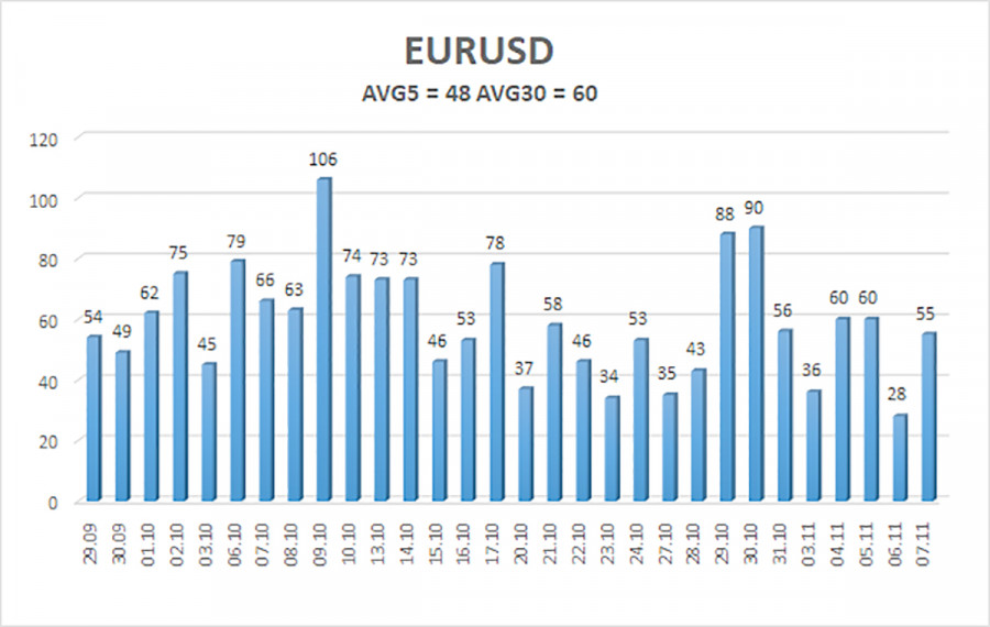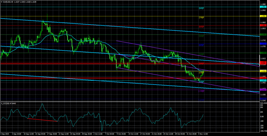 Валютная пара EUR/USD в течение четверга вновь торговалась с минимальной волатильностью и без какого-либо желания двигаться в любую сторону. В целом, по итогам четверга на валютном рынке мало, что поменялось. Если в Великобритании состоялось хотя бы заседание Банка Англии, результаты которого могли удивить трейдеров, то в Евросоюзе было опубликовано два рядовых отчета, которые абсолютно никакого не заинтересовали. И это не удивительно, ведь на этой неделе рынок со спокойной душой уже проигнорировал гораздо более важные отчеты ISM и ADP. Таким образом, чему удивляться, если рынок не обратил внимания на промышленное производство в Германии(которое, как обычно, оказалось хуже прогнозов) и розничные продажи(которые тоже оказались хуже ожиданий)? Мы уже больше месяца подряд говорим, что текущее падение евро и укрепление доллара – полностью алогичны. Началось все еще в начале октября, когда Дональд Трамп начал вводить новые тарифы. Напомним, что под «сборы» попали все грузовики, импортируемые в США, лекарства и даже мебель. Чуть позже Дональд Трамп объявил о повышении пошлин для Индии до 50%, а еще немного позже – о повышении пошлин для Китая на 100%. И все это время доллар преспокойно рос. Да, ближе к концу месяца торговая напряженность между Штатами и Поднебесной немного спала, а сторонам даже удалось подписать некий вариант перемирия. На один год. Но как можно считать, что доллар рос на этой новости, если он точно также рос на усилении напряженности между двумя «гигантами» политической карты мира? Не стоит также забывать и о «шатдауне». Когда он только-только начался, эксперты на всех углах трубили о том, что теперь-то доллару не сдобровать. Но, как видим, весь октябрь-месяц, американская валюта дорожала, а «шатдаун» стал еще одним фактором, который рынок попросту проигнорировал. Как не вспомнить и о «голубиной» политике ФРС. В сентябре и октябре ФедРезерв понизил ключевую ставку дважды, но доллар даже в этом случае продолжал расти. Несмотря на то, что ЕЦБ и Банк Англии сохранили свои ключевые ставки на прежнем уровне. Конечно, многие «эксперты» тут же начали говорить о «недостаточно голубином настрое ФРС», чтобы хоть как-то объяснить рост американской валюты. Мы же напоминаем, что на рынке хватает с головой движений, которые крайне сложно объяснить. Или попросту невозможно. Поэтому, когда наблюдается именно такое движение, следует смотреть правде в глаза, а не придумывать доводы. С нашей точки зрения, единственное, что может объяснить текущее падение пары – это флэт на дневном ТФ. Флэт – это весьма специфический период времени, а не просто нахождение цены в определенном диапазоне. Цена не просто так находится в нем. Обычно флэт обозначает накопление или распределение позиции маркет-мейкерами. Поэтому внутри флэта движения могут быть любыми и никоим образом не соответствовать фундаменту или макроэкономике. Средняя волатильность валютной пары EUR/USD за последние 5 торговых дней по состоянию на 7 ноября составляет 48 пунктов и характеризуется, как «низкая». Мы ожидаем движение пары между уровнями 1,1491 и 1,1587 в пятницу. Старший канал линейной регрессии направлен вниз, сигнализируя о нисходящей тенденции, но по факту продолжается флэт на дневном ТФ. Индикатор CCI заходил в октябре в область перепроданности дважды(!!!), что может спровоцировать новый