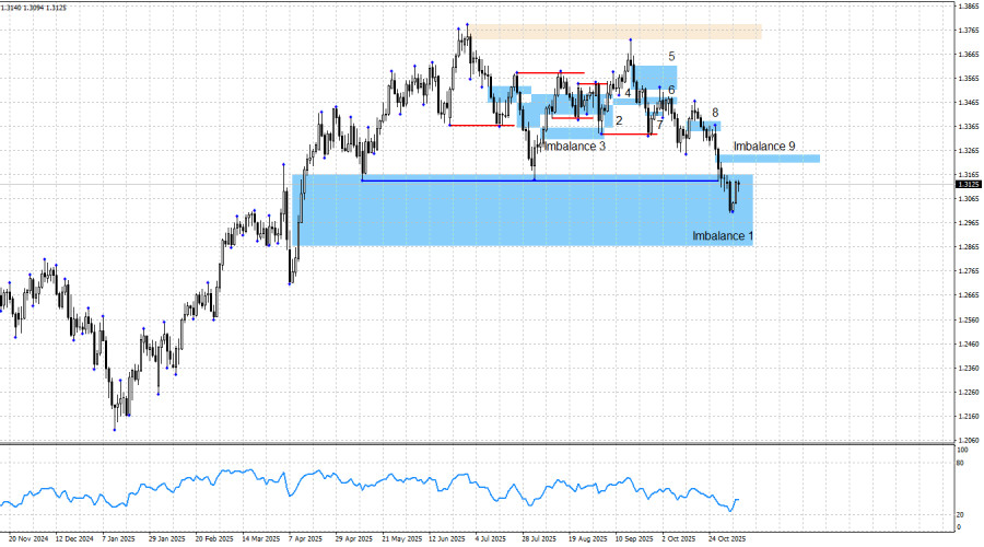 В пятницу информационный фон для британца и американца отсутствовал, но ранее на неделе у трейдеров было достаточно событий и данных для принятия торговых решений. На мой взгляд, практически все события рынок исковеркал, приняв абсолютно неочевидные решения. Индексы деловой активности ISM в США и отчет ADP рынок не почтил своим вниманием, зато на очередное заявление Канцлера Великобритании Рейчел Ривз о повышении налогов отреагировал бурными продажами. Вчера Банк Англии сохранил параметры ДКП без изменений, но был на грани того, чтобы принять «голубиное» решение. И британец на этом событии показал внушительный рост, что не вяжется с самим событием. Советую в данное время больше внимания уделять паре EUR/USD, а GBP/USD, вероятнее всего, пойдет за ней. В США общий информационный фон остается таковым, что ничего, кроме падения американца, в долгосрочном плане ожидать нельзя. Ситуация в США сложилась достаточно сложная. «Шатдаун» продолжается уже больше месяца, демократы и республиканцы по-прежнему не желают уступать друг другу, статистики по рынку труда нет, заседание FOMC завершилось принятием «голубиного» решения, трейдеры уверены в дальнейшем смягчении ДКП. На мой взгляд, у быков есть все, чтобы начать новое наступление, но быки пока не торопятся переходить в наступление. Для «медвежьего» тренда нужен сильный и стабильный для британца позитивный информационный фон, которого нет и не было. Чем ниже проседает курс британской валюты, тем выгоднее быкам открывать новые сделки на покупку. Последнее наступление медведей началось после реакции на «медвежий» ордер-блок, а затем было поддержано тремя имбалансами. На прошлой неделе был образован еще один «медвежий» имбаланс. Фактически «бычий» тренд можно считать завершенным, поэтому имбаланс 9 приобретает «медвежий» смысл. Но с выводами я все же не стал бы спешить. В общем и целом, могу сказать следующее. В «медвежий» тренд по британцу я по-прежнему не верю, несмотря на довольно сильное падение, которое длится уже месяц. Слишком много факторов риска остается висеть мертвым грузом на долларе США. Текущий «бычий» тренд можно считать завершенным, так как котировки выполнили падение ниже двух лоу (от 12 мая и 1 августа). Но за счет чего медведи будут двигать фунт дальше вниз? Именно потому, что я не могу вразумительно ответить на этот вопрос, я не считаю, что процесс падения будет продолжен. Календарь новостей для США и Великобритании: 10 ноября календарь экономических событий не содержит в себе ни одной записи. Влияние информационного фона на настроение рынка в понедельник будет отсутствовать. Прогноз по GBP/USD и советы трейдерам: По британцу картина остается достаточно сложной. Паттернов было образовано в последние месяцы много, но большинство из них противоречило направлению «бычьего» тренда. Я не вижу никаких информационных оснований для «медвежьего» тренда в данное время. Ожидать возобновление «бычьего» тренда можно из зоны имбаланса 1, которая достаточно широка. Если начнется хотя бы небольшой рост британца, затем можно отслеживать образование новых «бычьих» паттернов, которые придадут уверенности в правильности ожиданий движения с целью 1,3725. Также в данное время уже нельзя игнорировать последний «медвежий» имбаланс 9, так как с каждым днем британец становится все ближе к «медвежьему» тр