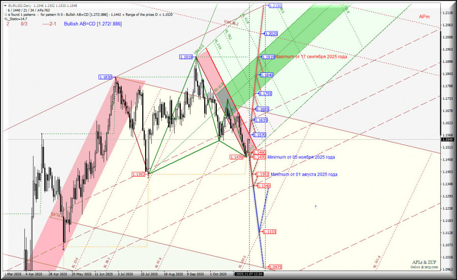 Операционный масштаб Minor (таймфрейм Daily)EUR/USD - Daily - обзор вариантов движения с 10 ноября 2025 г.Предыдущий обзор Euro vs US Dollar (таймфрейм h4) от 05.11.2025 г. 14:51____________________Euro vs US DollarЕдиная европейская валюта - EUR/USD-Daily - с 10 ноября 2025 года продолжит движение в канале 1/2 Median Line (1.1340 - 1.1490 - 1.1635) вил старшего операционного масштаба Minor-Daily , а направление этого движения будет зависеть от отработки и направления пробоя диапазона:- уровень сопротивления 1.1570 на границе красной зоны RZL вил младшего операционного масштаба Minute-h4;