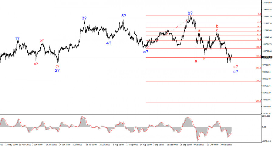 Исходя из проведенного анализа BTC/USD, я по-прежнему считаю, что построение повышательной структуры завершено. Если это предположение неверно, я в любом случае будут ожидать понятной коррекционной структуры прежде, чем рассматривать покупки. Новостной фон не был причиной резкого роста биткоина в последние месяцы, он также не был причиной последнего краха. Биткоин четырежды не сумел преодолеть отметку 122000$, каждый подход к ней сопровождался довольно сильным падением. Исходя из всего вышесказанного, я ожидаю продолжения построения волны с с целями, расположенными около отметки 95400$, что соответствует 161,8% по Фибоначчи.Основные принципы моего анализа: