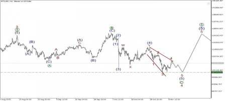 Предполагается, что по криптовалютной паре BTC/USD в глобальной перспективе может формироваться крупный бычий импульс 1-2-3-4-5. Большая часть указанной фигуры полностью завершена. На текущем графике представлена разметка боковой коррекции 4, которая может принять форму волновой плоскости [A]-[B]-[C].Две коррекционные волны [A]-[B] уже завершены, где [B] - волновая плоскость меньшего волнового уровня. Сейчас в процессе построения может находиться заключительная импульсная волна [C]. Внутри медвежьего импульса завершены четыре части - подволны (1)-(2)-(3)-(4). В настоящее время формируется финальная волна (5).Предполагается, что волна (5) может принять форму конечного диагональника, и что цена может упасть к предыдущему минимуму 98794.62. Ранее на указанной отметке была завершена волна 3 этого конечного диагональника.В текущей ситуации можно рассматривать открытие коротких позиций с целью забрать прибыль на завершении коррекционной волны 4Торговые рекомендации: Sell 108038.59, takeprofit 98794.62.Материал предоставлен компанией InstaForex - www.instaforex.com