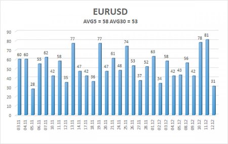 Валютная пара EUR/USD в течение пятницы торговалась уже гораздо более спокойно, чем в среду и четверг, что отлично видно на иллюстрации ниже. Волатильность в последний торговый день прошлой недели составила «нереальные» 31 пункт. То есть, по сути, мы в очередной раз стали свидетелями полного отсутствия каких-либо движений на рынке. В принципе, это не удивительно, так как важных событий в пятницу практически не было, а за четверг трейдеры успели полностью отработать результаты заседания ФРС. Кстати, сказать, что волатильность зашкаливала в среду и четверг, тоже не получится. Да, она была выше, чем обычно, но не супер-высокой. Таким образом, мы опять-таки обращаем внимание трейдеров на тот факт, что активность рынка сейчас очень невысока. Может ли что-то измениться в течение текущей недели? Теоретически, да, так как мы считаем, что отчеты по безработице, рынку труда и инфляции в США сейчас даже важнее, чем заседание ФРС. Все просто: ФедРезерв вновь принял решение в информационной пустоте, не имея никаких, по сути, оснований ни повышать ключевую ставку, ни снижать ее. По состоянию на 10 декабря, никаких новых данных в распоряжение американского регулятора так и не поступило. Поэтому отчеты, которые выйдут на этой неделе, будут определять направление монетарной политики ФРС в следующие несколько месяцев. В декабре решение о снижении ставки было принято, но рынок к нему отнесся настороженно, так как не понимает вектора дальнейшей политики. Это было решение, принятое просто в воздухе. Очевидно, что рынок труда США находится не в лучшем состоянии, но достоверно о его состоянии невозможно судить по отчетам JOLTs и ADP. Таким образом, макроэкономические данные на этой неделе укажут дальнейший путь доллару, хотя мы считаем, что он и без этой информации очевиден. Что еще интересного будет в ходе следующих пяти торговых дней? В Евросоюзе будут опубликованы промышленное производство, индексы деловой активности в секторах услуг и производства, инфляция. И это мы перечислили наиболее важные отчеты, а есть еще масса второстепенных. Вишенкой на торте станет заседание ЕЦБ, но вишенкой не самой крупной, красивой и сладкой. Как мы уже говорили, много раз, ЕЦБ добился цели по инфляции, поэтому параметры монетарной политики менять нет никакой нужды. Тем не менее, интересная информация может все же поступить. Например, Кристин Лагард допустит, что в следующем году регулятор повысит один или несколько раз ключевую ставку. Если это случится, европейская валюта может начать расти более быстро, хотя и без «ястребиного» настроя ЕЦБ факторов дальнейшего роста у пары EUR/USD хватает с большим запасом. И даже относительно «нейтральный» настрой ФРС на следующий год не должен стать спасительным для американской валюты. С технической точки зрения, сохраняется восходящий тренд. С фундаментальной точки зрения, практически все факторы – против доллара. Мы будем допускать и ожидать рост американской валюты только, когда ситуация начнет меняться в его пользу. Средняя волатильность валютной пары EUR/USD за последние 5 торговых дней по состоянию на 15 декабря составляет 58 пунктов и характеризуется, как «средняя». Мы ожидаем движение пары между уровнями 1,1682 и 1,1798 в понедельник. Старший канал линейной регрессии направлен вниз, сигнализируя о нисходящей тенденции, но по факту продолжает